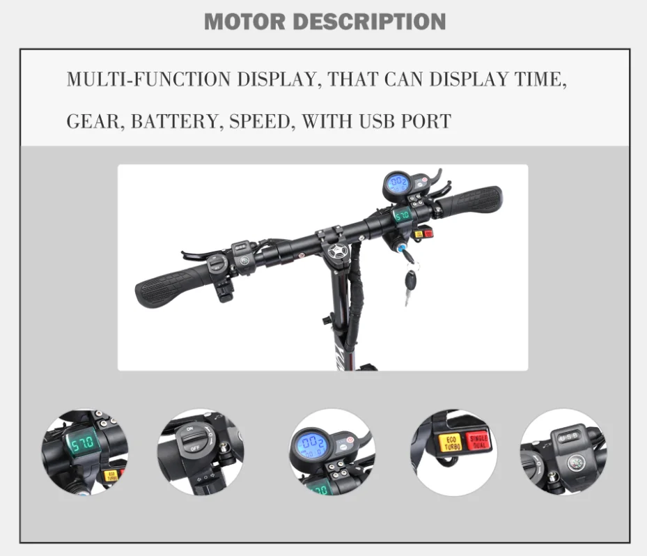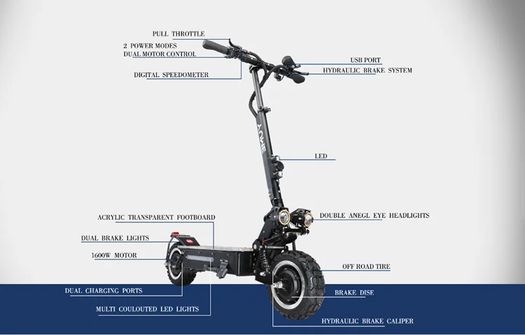 К этому скутеру прилагается подвесной светильник, сиденье, два зарядных устройства, инструменты, подушечки brakd, пожалуйста, учтите, что в данный момент Скутер работает с ключом напряжения. У нас есть шины для внедорожников на ваш выбор.