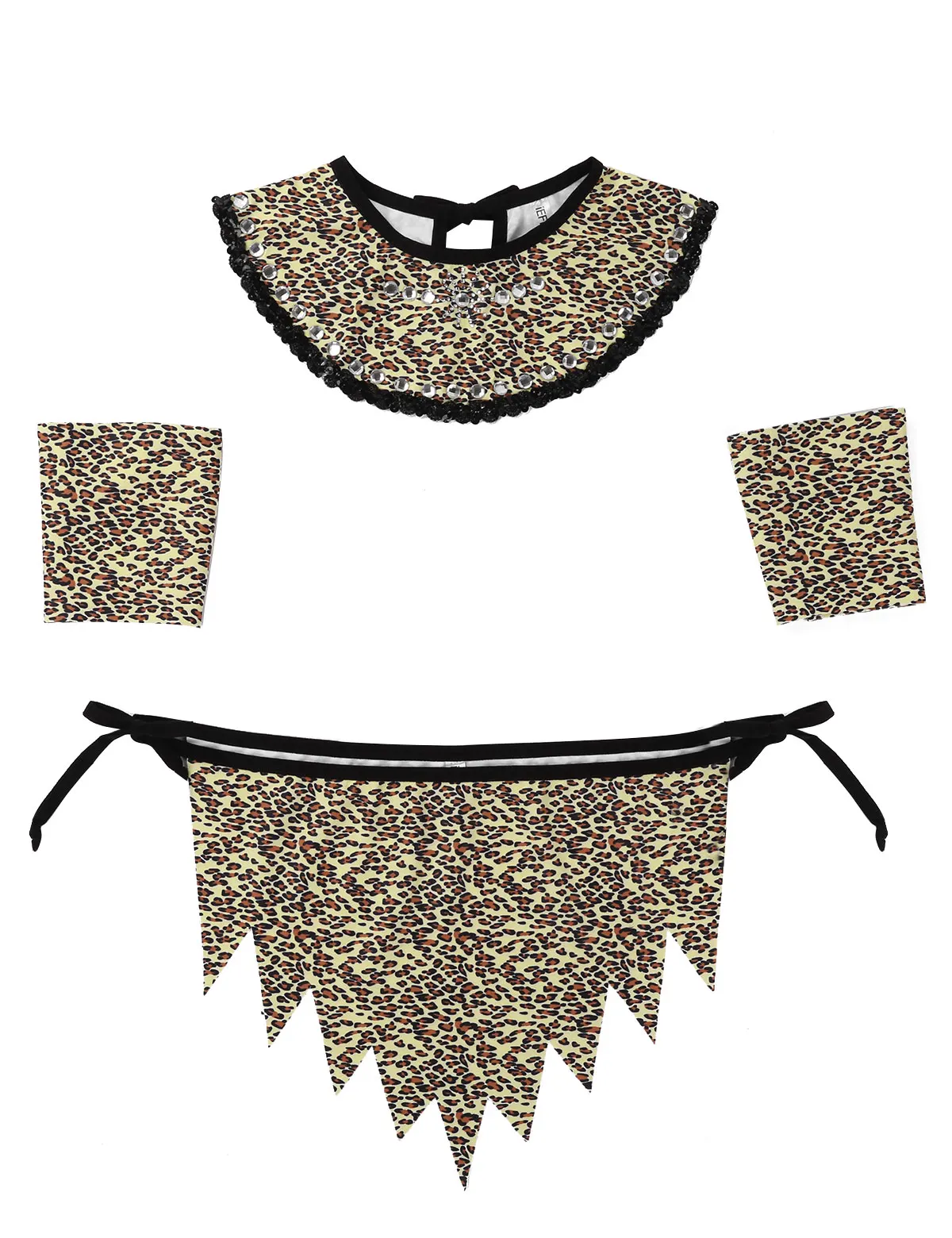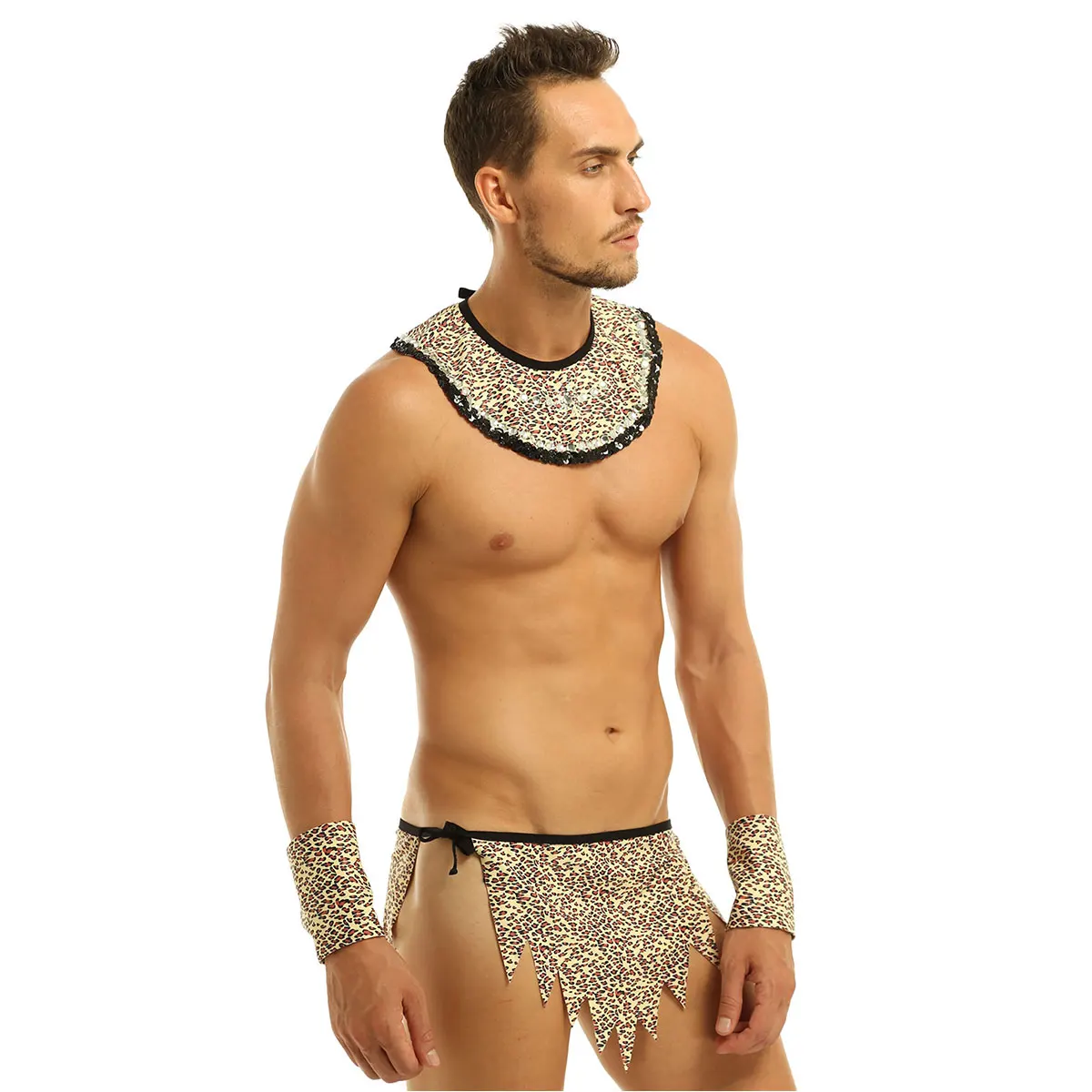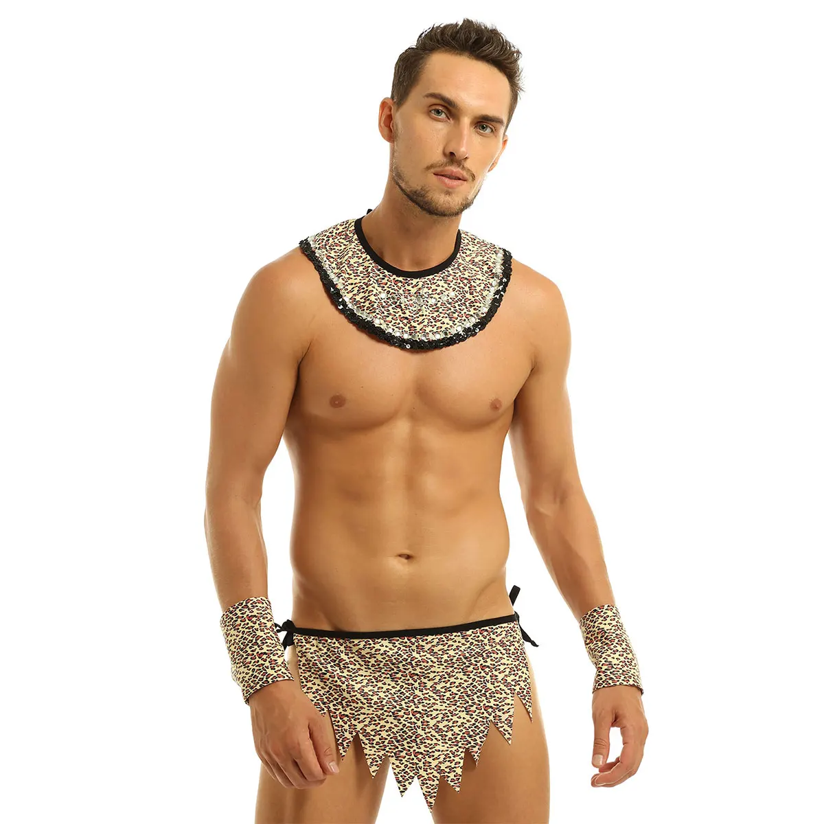Men Adults Leopard Print Savage Costume Caveman Cosplay Set for Party Halloween Dress Up. Collar decorated with shiny rhinestones and sequin trim, with strap tie at back. Jagged hem loincloth has adjustable side ties. Matching a pair of wristbands with button closure. Good stretchy fabric, soft and comfortable to wear. Great for date nights, wedding nights, bridal shower, honeymoon, fantasy or Halloween costume. Please check the size chart clearly before ordering. Hand wash recommended, machine washable.