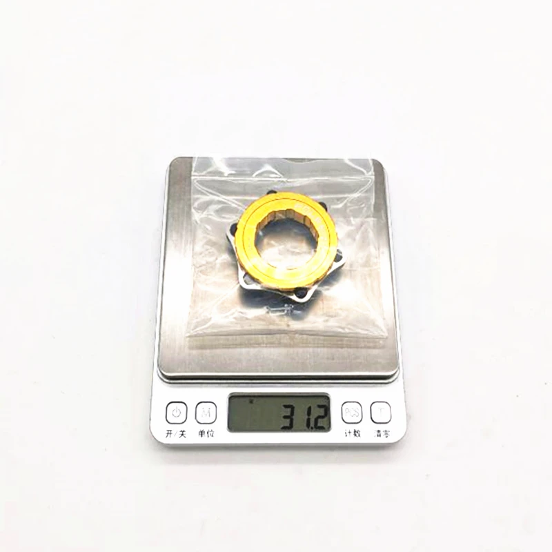 Адаптер ротора дискового тормоза совместим с системой центрального замка. . Материал: AL6061-T6 адаптер и кольцо . Шайба из нержавеющей стали . S.B анодированное Золотое кольцо с замком . Вес: 31,2 г