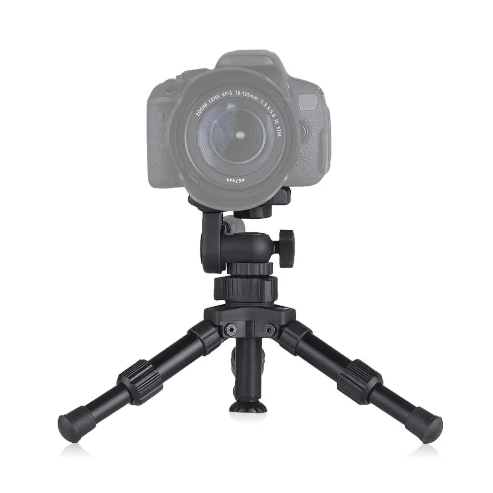 Мини складной штатив, вес всего 446 г, портативный для переноски. 2х секций, высота регулируется от 17 до 23 см. Поддержка панорамирования на 360 °, наклона на 180 ° и поворота на 90 °. Универсальный 1/4 "винт работает с DSLR камерой, экшн-камерой, цифровой видеокамерой и т. Д. Изготовлен из высококлассной алюминиевой трубки и пластика, может выдерживать нагрузку до 4,5 кг. Встроенный пузырьковый уровень помогает точно настроить баланс.