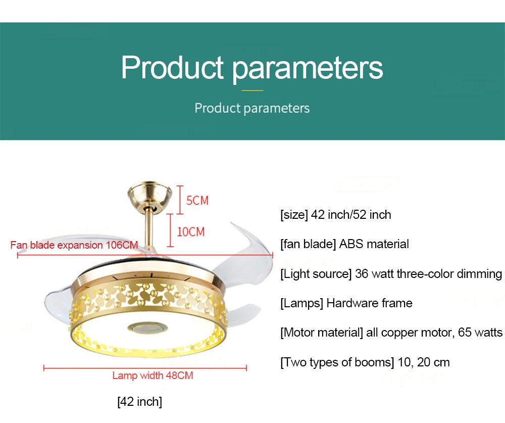 [Размер] 42 дюйма/52 дюйма [Лопасть вентилятора] фанерное деревянное лопасть вентилятора Расширение лопасти вентилятора 106 см [Источник света] триколор 12 Вт [Лампы] стеклянный абажур Ширина лампы 48 см [Материал мотора] медный мотор, 75 Вт [Два типа бумов] 10, 20 см [42 дюйма]
