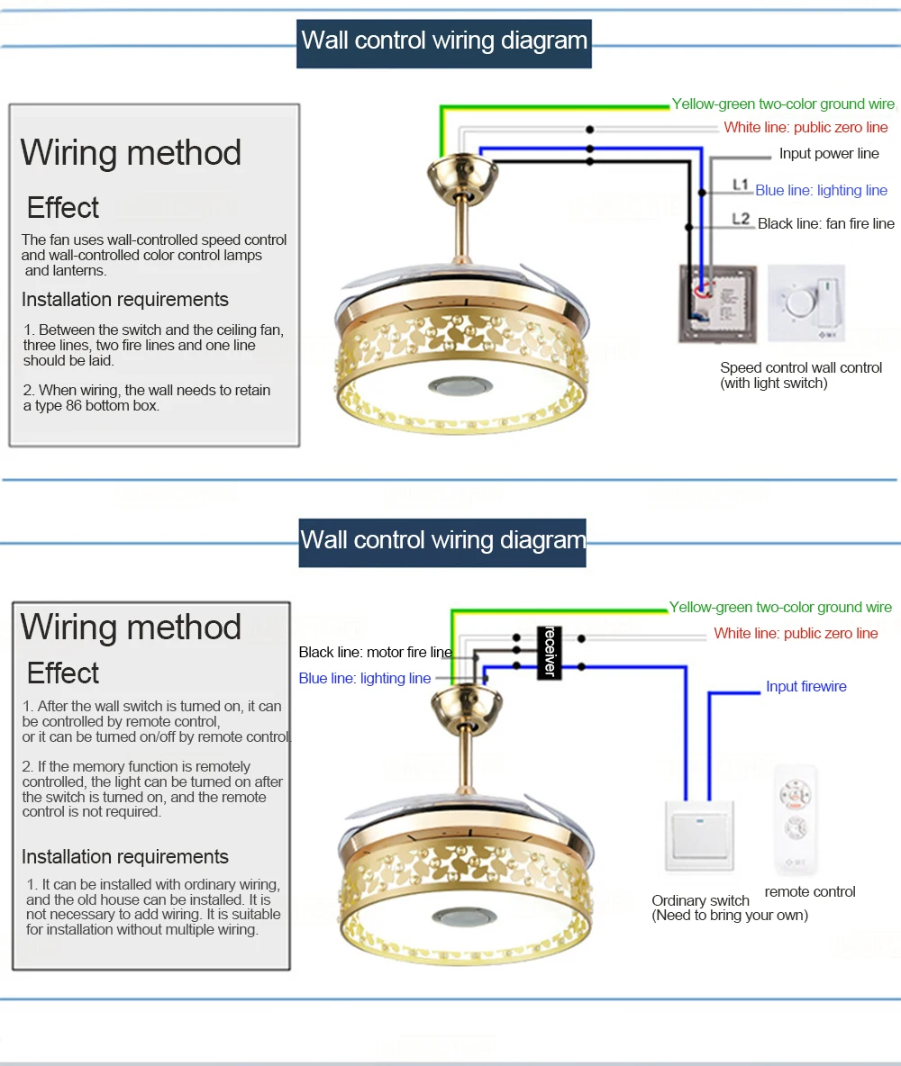 На иллюстрации показано, что потолок декоративного потолка должен быть установлен на цементной доске заранее, а подвесной стержень и провод подвергаются горизонтальной линии декоративного потолка, В зависимости от ситуации, длина определяется высотой потолка. Напоминание: лопасть вентилятора составляет более 25 см от потолка, в противном случае это повлияет на ветер. На иллюстрации показан деревянный потолок с деревянным потолком. Место установки должно быть усилено, чтобы выдерживать вес 20 кг. Толщина деревянной доски в подъемном положении не менее 30 мм. Когда украшение будет завершено, мастер должен заранее усилить утолщение в этом положении.