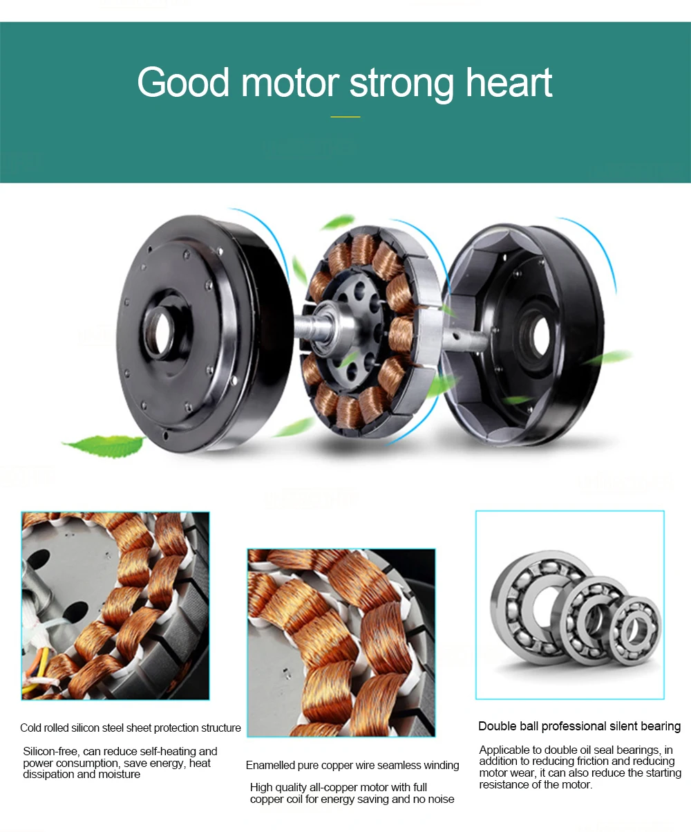 1. Холоднокатаная Кремниевая стальная защитная структура листа 2. Без кремния, может уменьшить самонагревание и энергопотребление, экономить энергию, рассеивание тепла и влагу 3. Эмалированная чистая медная проволока бесшовная обмотка 4. Высококачественный медный мотор с полностью медной катушкой для экономии энергии и без шума 5. Двойной шариковый Профессиональный бесшумный подшипник 6. Применяется для двойных подшипников уплотнения масла, в дополнение к уменьшению трения и уменьшению износа двигателя, это также может уменьшить начальное сопротивление двигателя.