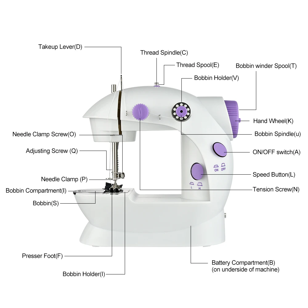 1 * мини швейная машина 1 * адаптер переменного/постоянного тока (штепсельная вилка ЕС или штепсельная вилка США для опций) 1 * ножная педаль 4 * металлические катушки 1 * игла 1 * игольчатый Шредер