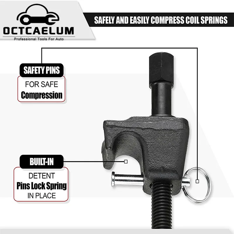 Челюсти изготовлены из кованой стали. Центральный винт закален для максимальной прочности и долговечности. Большая площадь поверхности для широкого пружинного контакта. Для замены амортизаторов и пружинных комплектов или ремонта изогнутых распорок и поврежденных шпинделей. Универсальный дизайн работает со всеми транспортными средствами, оснащенными стойки Macpherson. Смазывайте нити с помощью анти-захватного соединения, чтобы продлить срок службы инструмента.