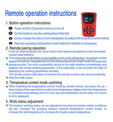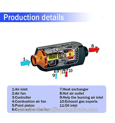 Стояночный обогреватель является автономным нагревательным устройством. Он имеет свой собственный топливный трубопровод, цепь, устройство отопления сгорания, система управления. Стояночный обогреватель заправляется дизельным маслом, Который поставляется масляным насосом. распылительное дизельное масло воспламеняется вилкой зажигания и полностью сжимается в камере сжатия для выпуска тепла. затем циркуляционный вентилятор выдувает тепло в низкотемпературное пространство, которое будет очень теплым в течение нескольких минут.