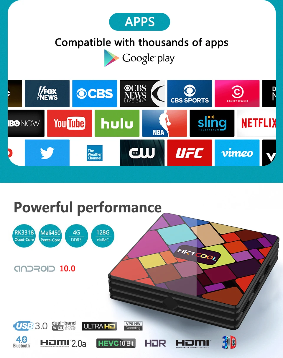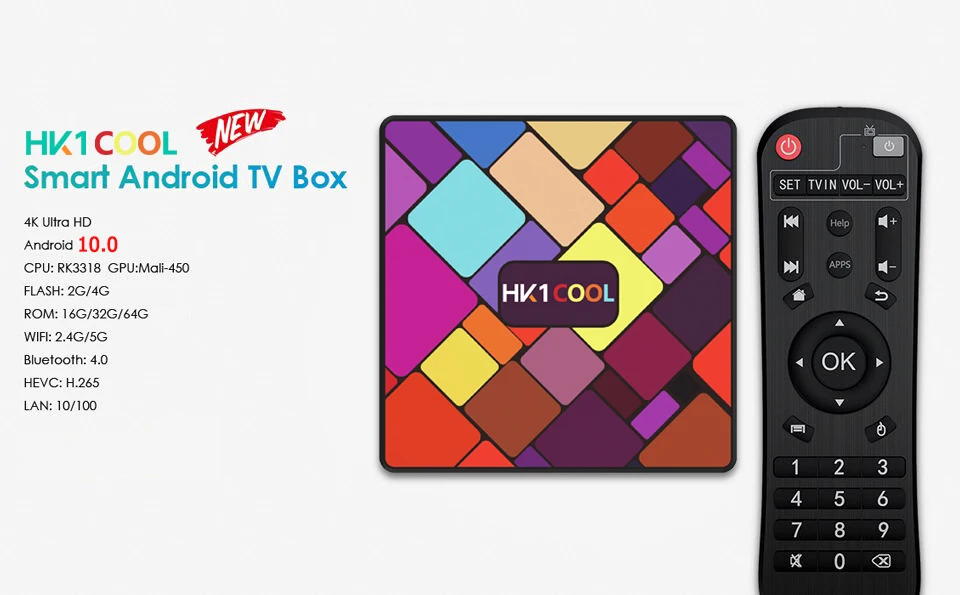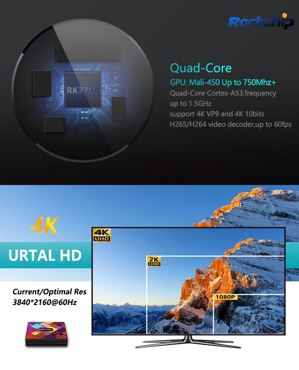 -CPU: четырехъядерный процессор RK3318 64 бит Cortex-A53; -GPU: Penta-Core Mali-450; -ОС: Android 10,0; -ОЗУ: 2 ГБ/4 Гб; -ROM: EMMC 16G/32G/64GB; -LAN Ethernet:10/100 м Стандартный RJ-45; -WiFi: 2,4G /5G двухдиапазонный Wifi 802,11 a/b/g/n; -Функция сети: KODI 18,1, Neflix, Vudu, Skype Chating, Picasa,Flicker,Youtube и т. Д.; -Поддержка H.265, 4K 60pfs, HD 2,0, USB3.0,USB2.0.
