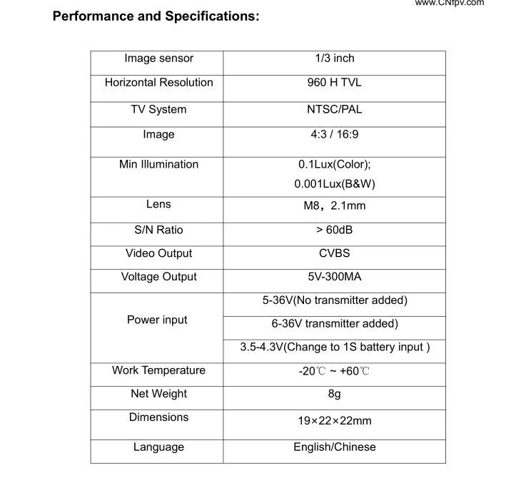 Описание: Название бренда: Hawkeye Название серии: Firefly Наименование товара: Fortress Версия: Ver 2,2 Цвет: черный Технические характеристики: Датчик изображения: 1/3 дюйма CMOS Горизонтальное Разрешение: 960 H TVL ТВ система: NTSC/PAL Изображение: 4:3 / 16: Мин. Освещение 0.1Lux (цвет); 0.001Lux(B & W) Объектив: M8, 2,1 мм Отношение S/N:> 60 дБ Видеовыход: CVBS Выходное напряжение: 5 В-300 мА Входная мощность: 5-36 в (не добавлен передатчик) 6-36 в (добавлен передатчик) 3,5-4,3 V (изменение 1S Батарея вход) Рабочее напряжение: 1S, 2S-6S LiPo Рабочая температура:-20 ℃ ~ + 60 ℃ Вес нетто: 8 г Размер: 19x22x22mm Язык: английский/китайский Передатчик Технические характеристики: Поставка Мощность: 3,3-5,5 V Входное сопротивление: 75 Ом Мощность Tx: 0,25, 50200 МВт Частота: 5,8 ГГц Канал: 48/72CH Разъем антенны: MMCX Размер: 18*20 мм Вес: 2 г Кнопка канала передатчика: Нажмите один раз: переключатель канала от 1 до 8. Нажмите 2 секунды: групповый переключатель канала от A до F или H. Нажмите 10 секунд: изменить мощность: 0 МВт, 25 МВт, 50 мВт, 200 МВт. Ленточный резистор (0Ω): Особенности: Небольшой размер и легкий. 2,1 мм M8 960H ТВЛ FPV/объектив. Поддержка 1S,2S-6S батареи. AIO доступен, с хорошо защищенной оболочкой. Поддержка 6 режимов регулировки. Настройка режима: Нажмите и удерживайте левую клавишу для переключения: облачно, внутри помещения, легкий, сумеречный, личный, солнечный. Вы можете настроить настройки в каждом режиме. Настройка мощности и настройка сигнализации низкого заряда: Нажмите и удерживайте правую клавишу для регулировки значения мощности; Нажмите Левую кнопку, чтобы установить сигнал тревоги. Вы можете настроить питание, нажав кнопку вверх/вниз.