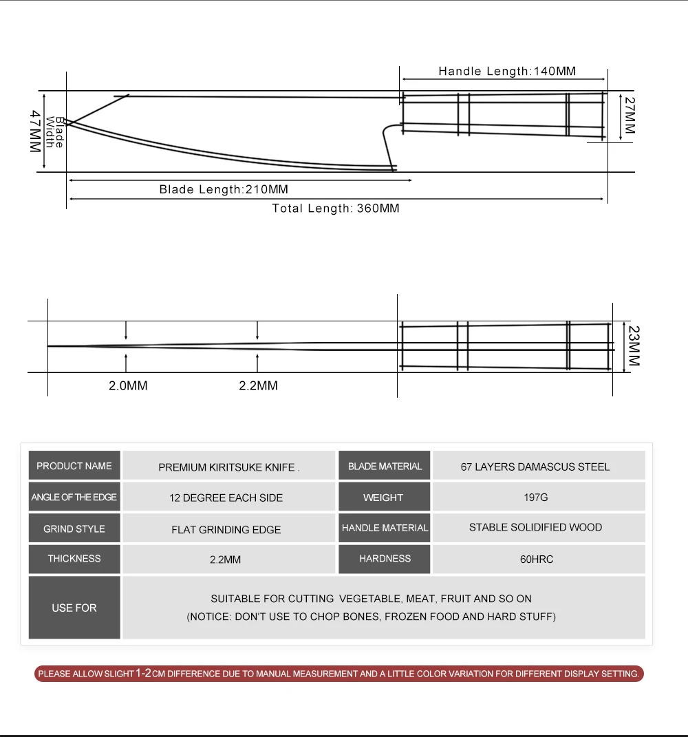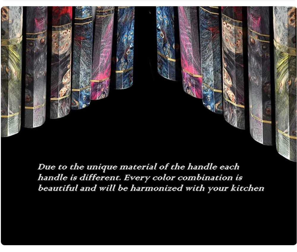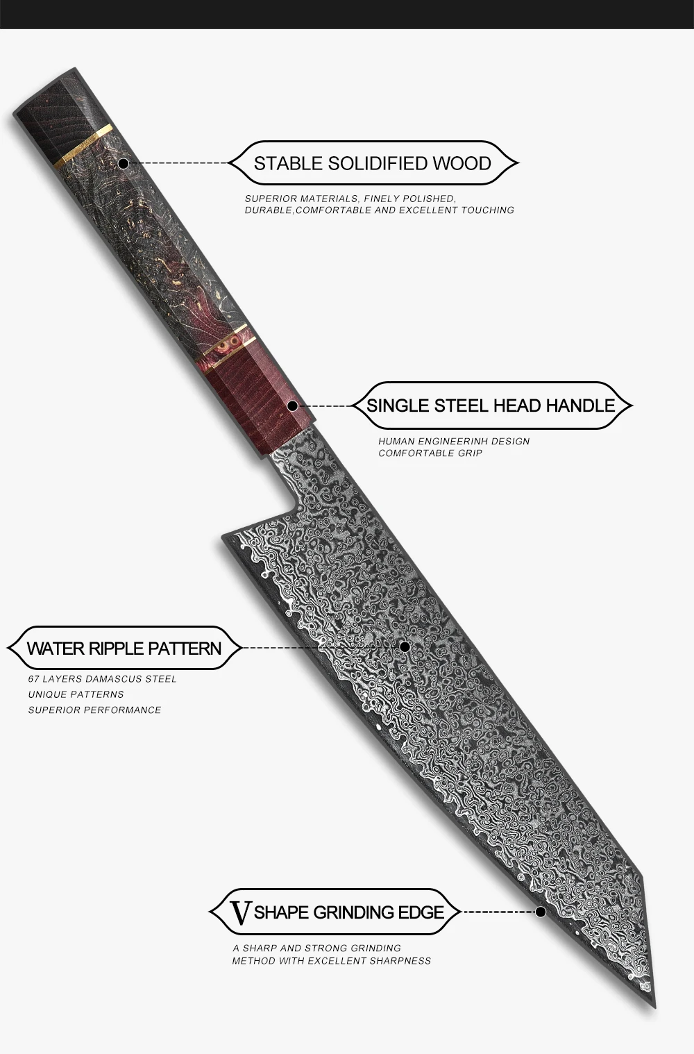 Изготовлен из 67 слоев дамасской стали, импортированной из Японии. VG-10 стальной режущий сердечник;