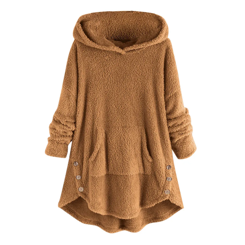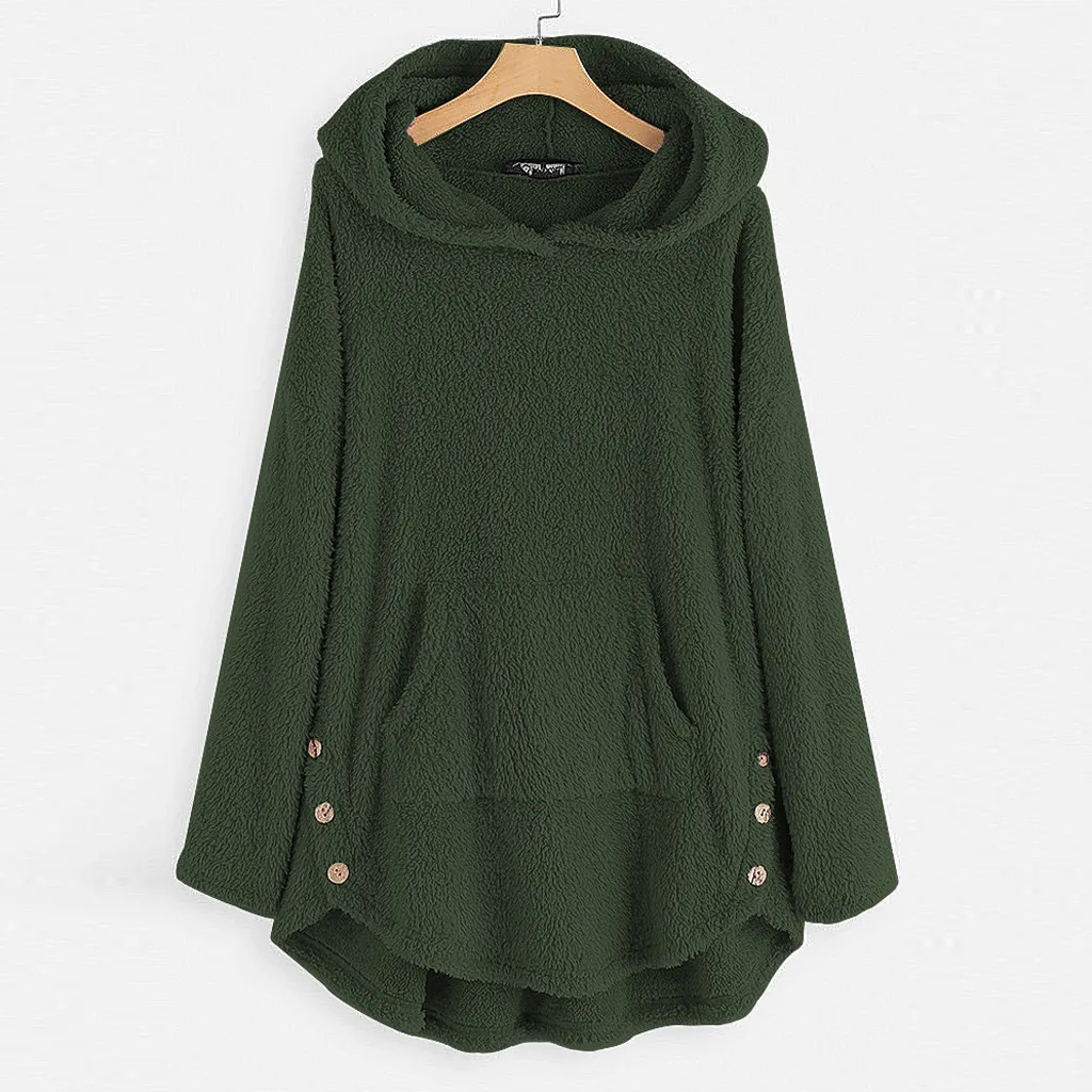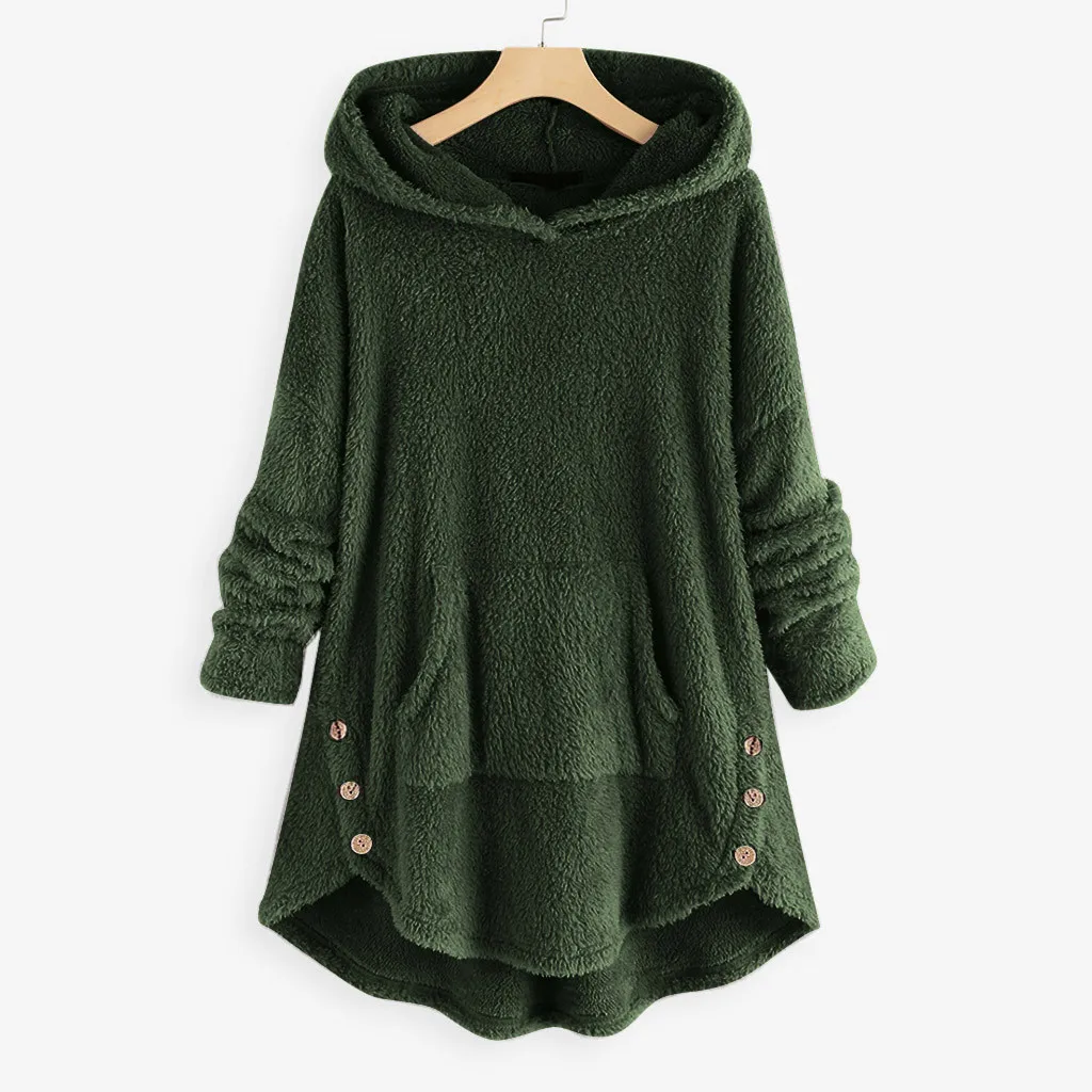 Women Fleece Asymmetrical Button Hem Plus Size Hoodie Top Sweater Blouse