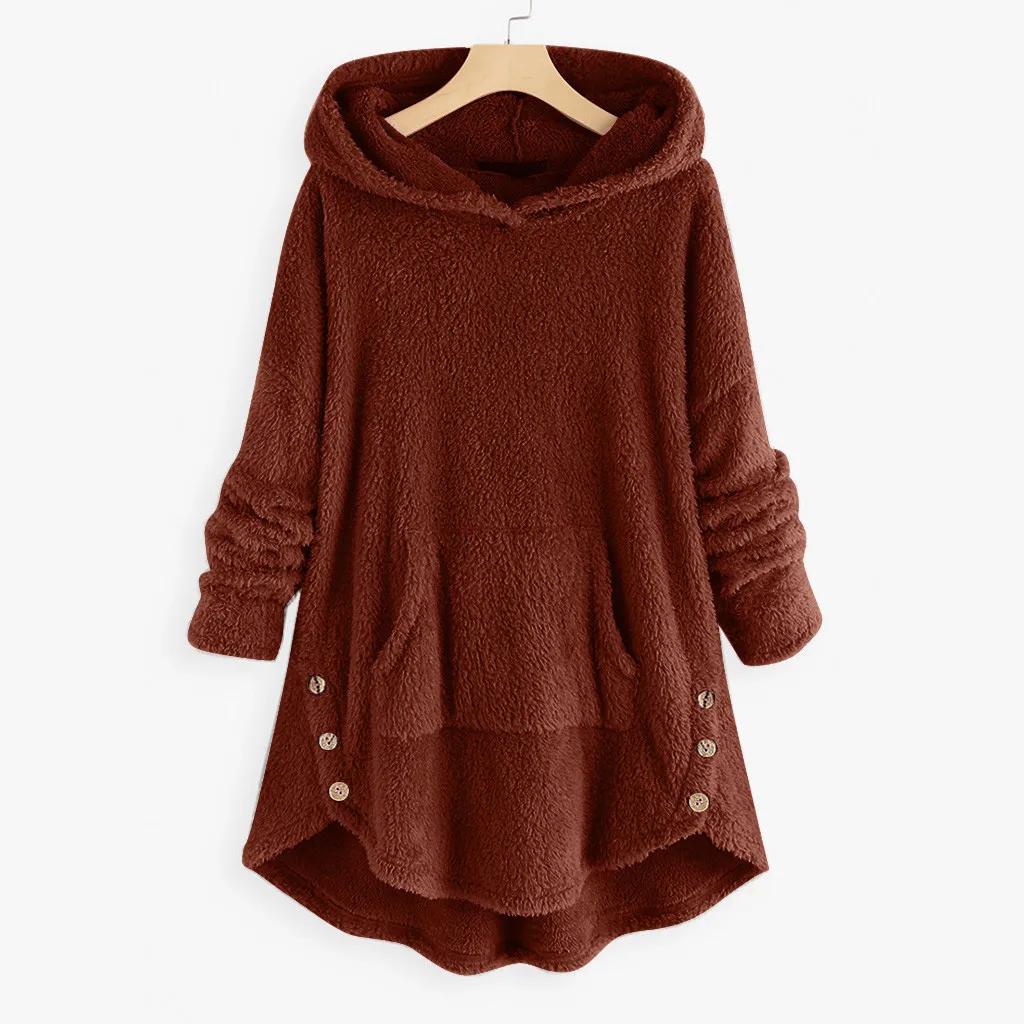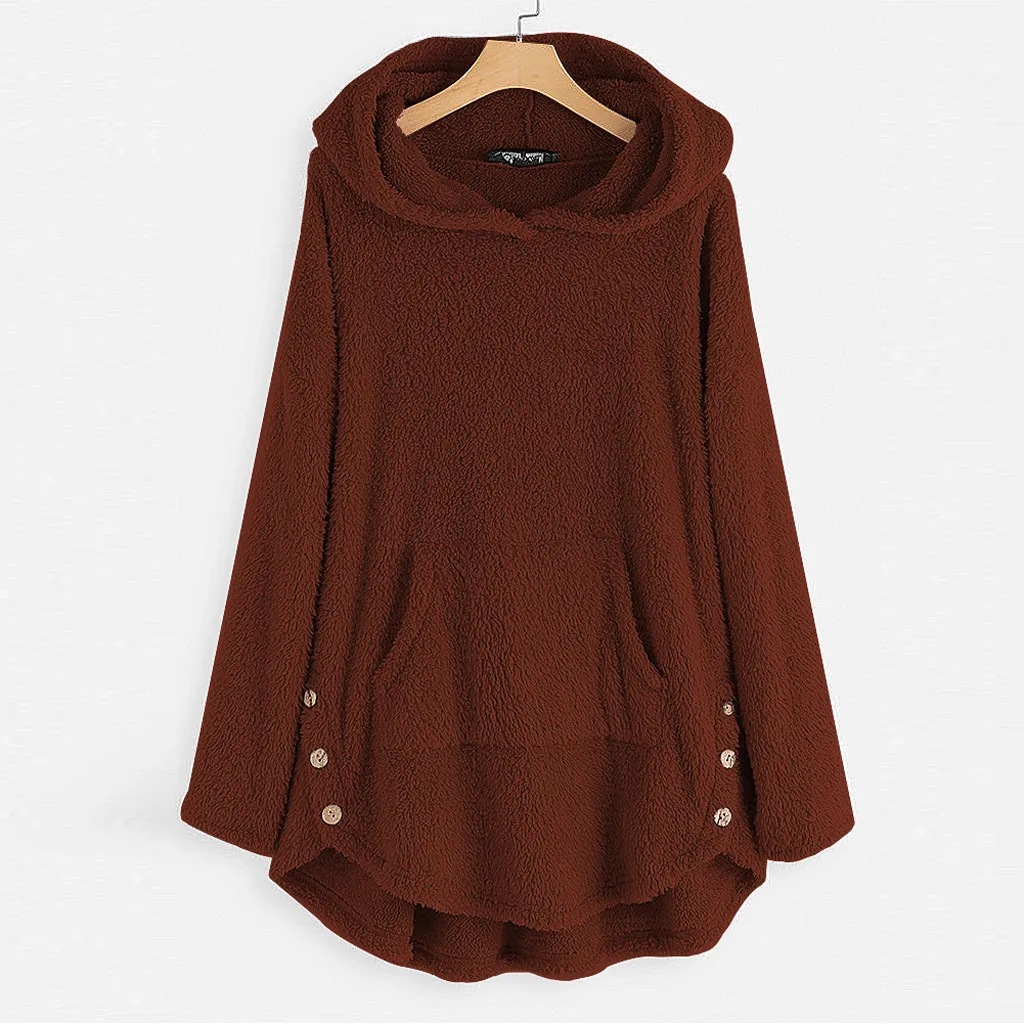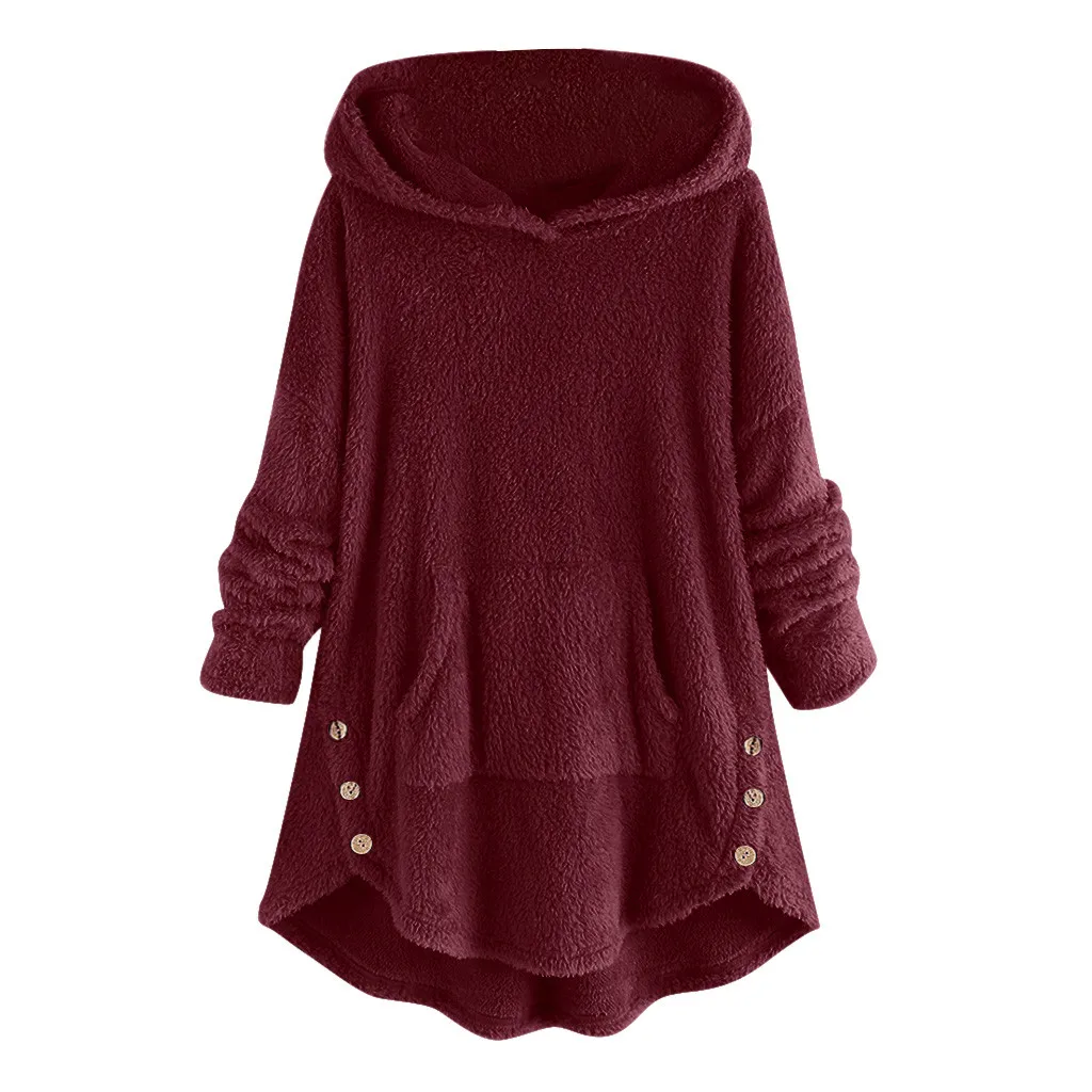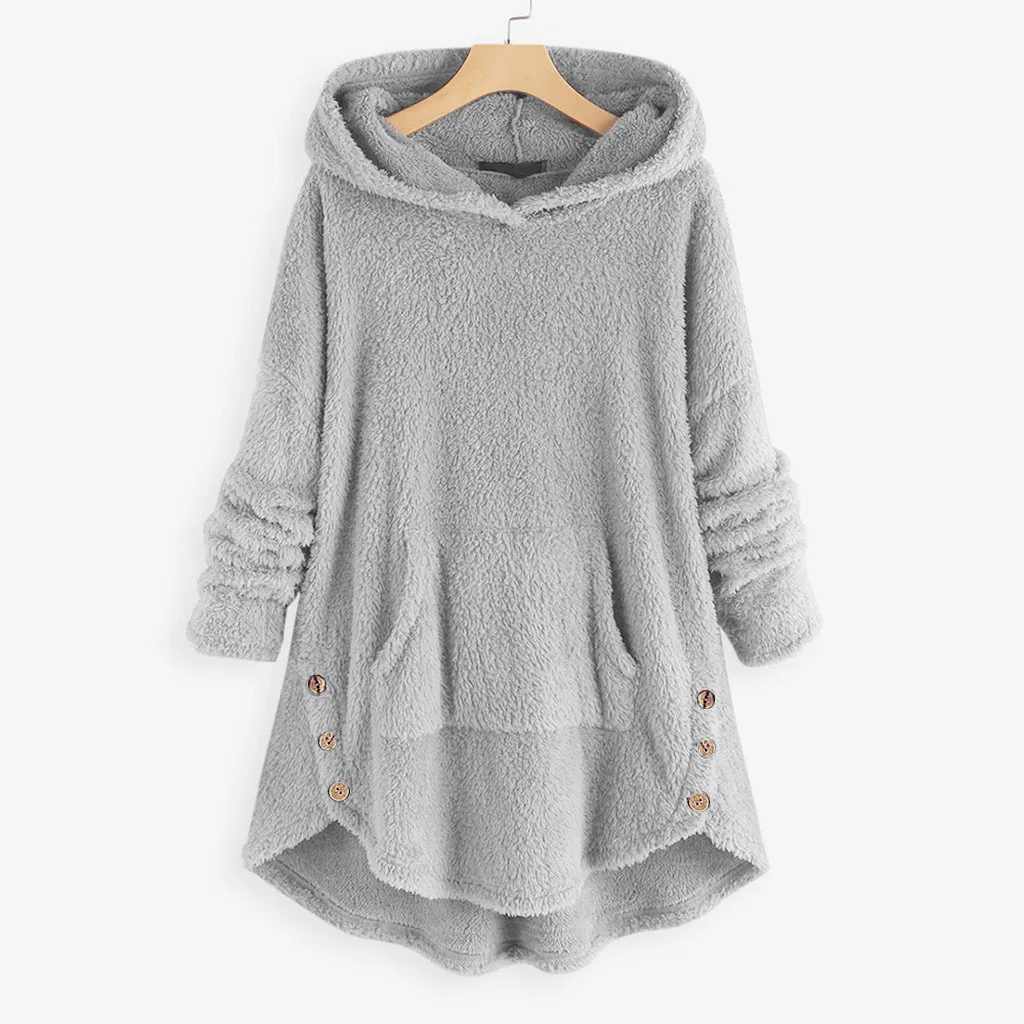 Women Fleece Asymmetrical Button Hem Plus Size Hoodie Top Sweater Blouse
