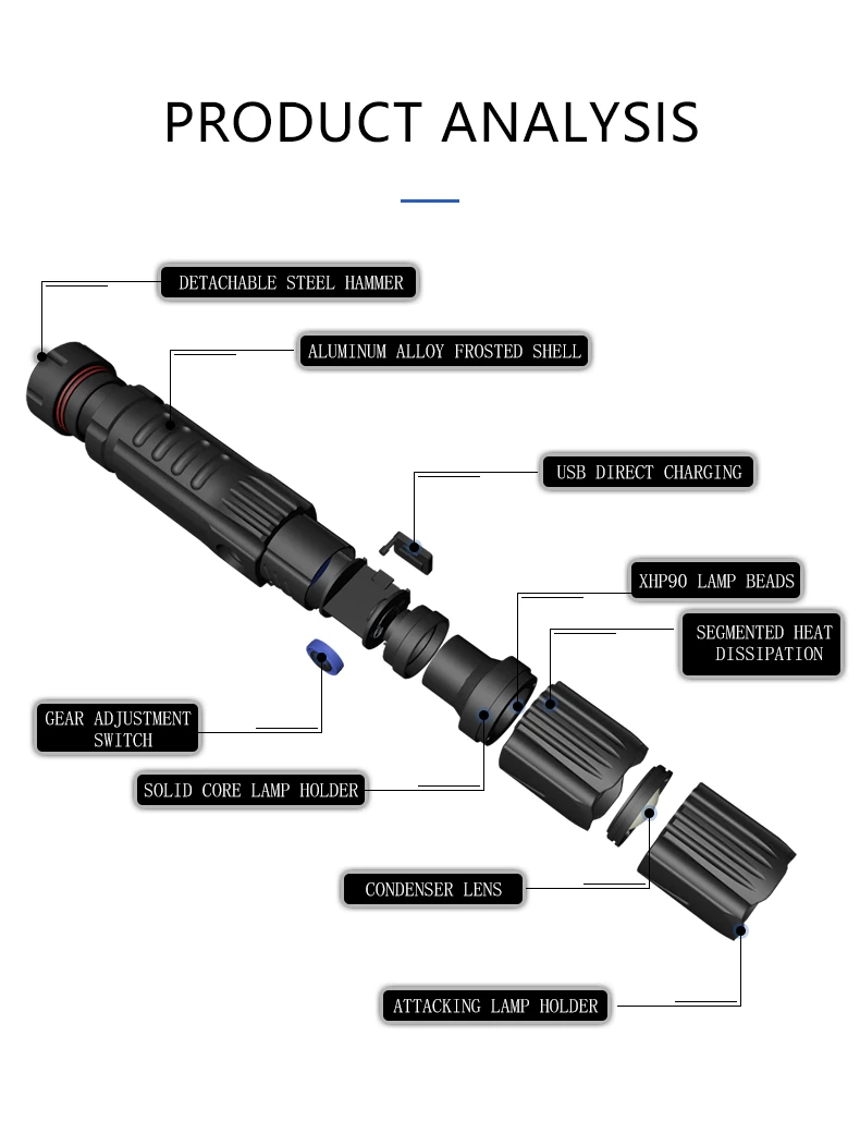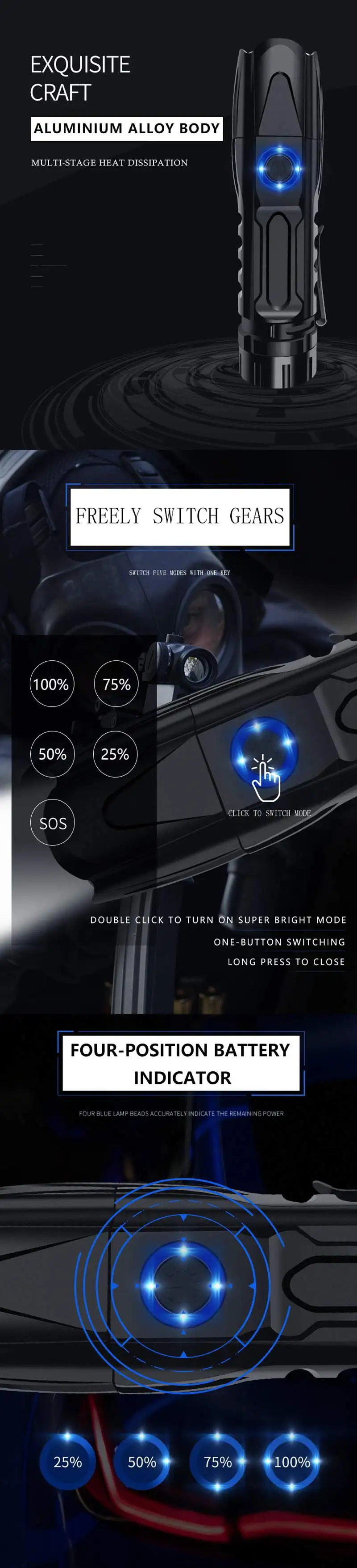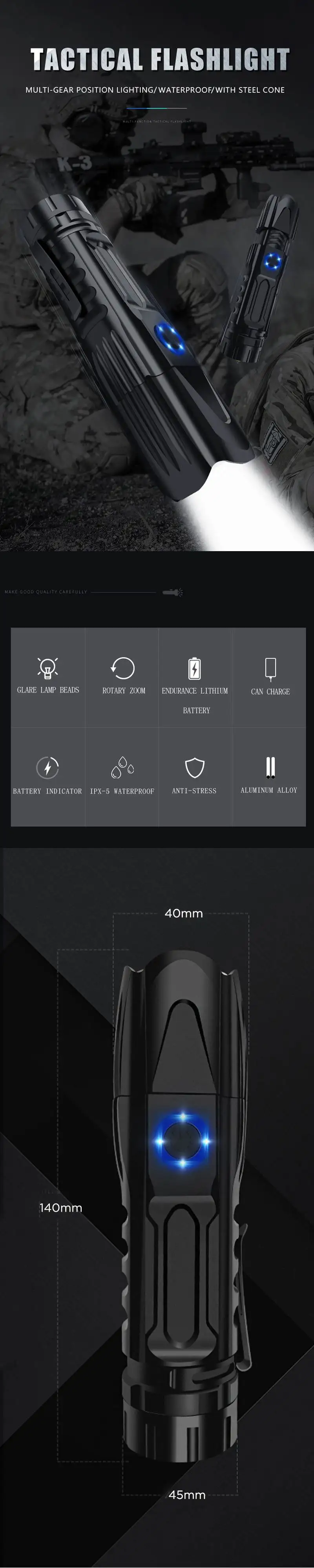 Бренд XANES W69 Модель Тактический фонарик Лампочка XHP50, XHP70, XHP90 Материал Алюминиевый сплав Переключатель Пресс-переключатель Аккумулятор 1 x аккумулятор 26650 (включая) Метод зарядки Usb-зарядка Режимы переключения 5 режимов (100%-75%-50%-25%-SOS) Режим масштабирования Механический растягивающийся зум Водонепроницаемый IPX5 Размер 140x40x45 мм