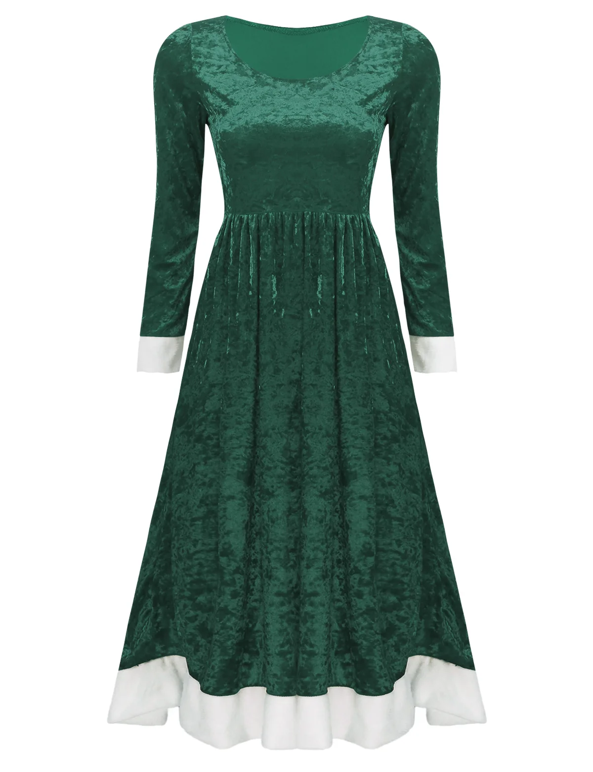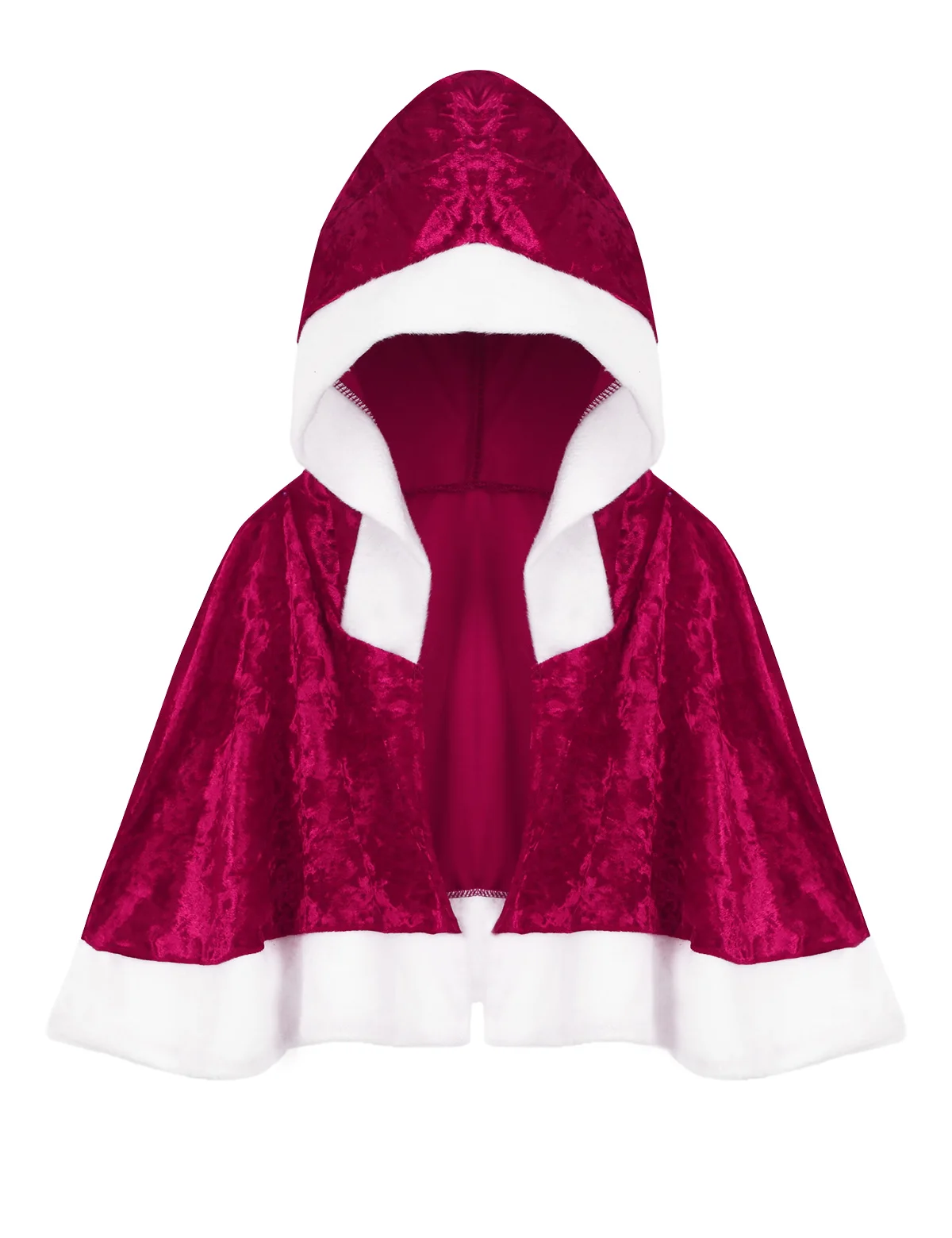 Платье средней длины с круглым вырезом и длинными рукавами, белые манжеты и подол из искусственного меха. Короткая накидка с капюшоном, чтобы завершить образ вашей миссис Клаус.