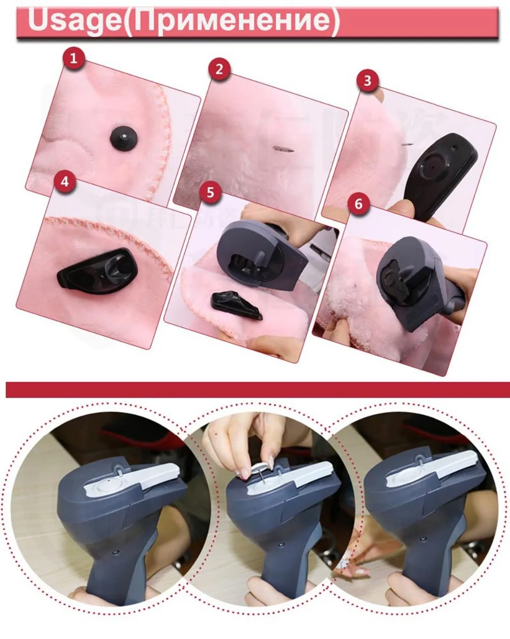 Деташер также обеспечивает канал в основании ручки, который может быть использован для выпрямления изогнутых тапочек на жестких бирках. Батареи или источник электропитания не требуются. Устройство для удаления наклеенных ярлыков включено в ремешок