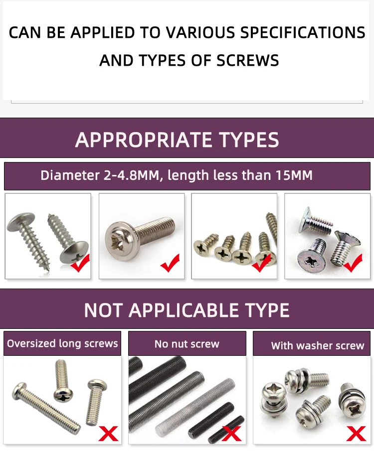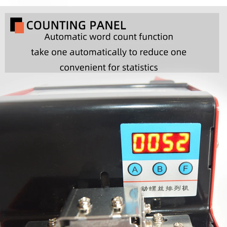 Входная мощность: AC100-240V Вес машины: 3,5 кг Длина винта: менее 15 мм Функция подсчета: может подсчитывать 9999 Размеры: 125*180*150 мм Диаметр винта: 2,0-4,8 мм Ширина дорожки: регулируется в соответствии с винтом