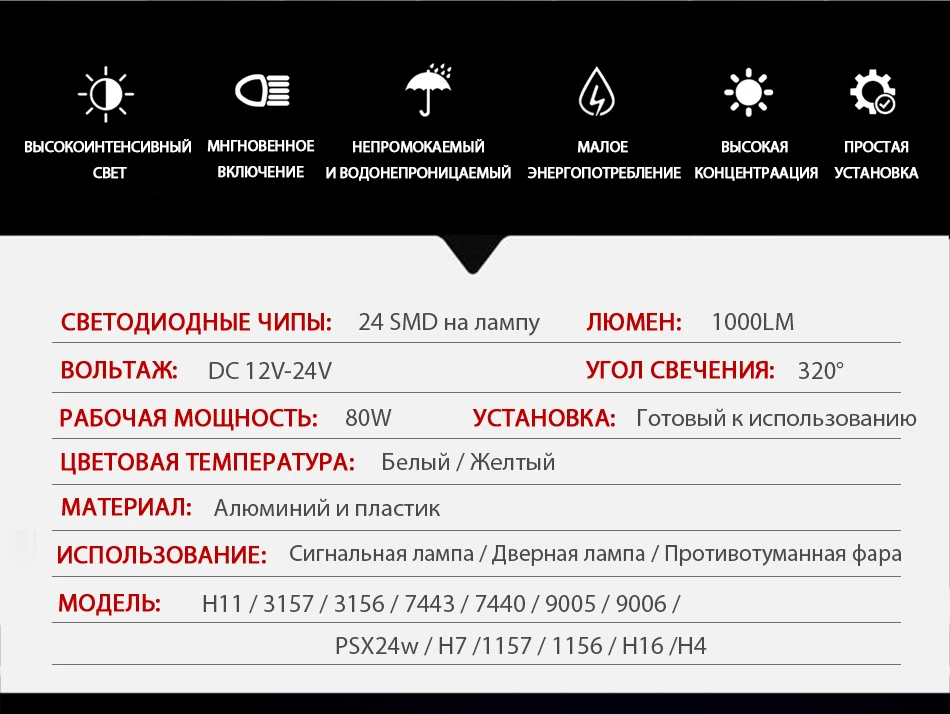 Параметры: -Pease не эта лампа не для фар или Дальний свет. -Новая светодиодный технология сокращает энергопотребление с 40% до 80%. -Для замены задних противотуманных фар и т. Д. -Материал корпуса: алюминиевый сплав, делает лампу работать под низким нагревом. -Цвет освещения: 6000 K чистый белый/3000 K Золотой Желтый -Светодиодный Тип: 21-3030SMD чипы -LEDLumen: 1200LM пара света -Светлый Ангел: 360 градусов -Рабочее напряжение: 12 В-24 В постоянного тока -Срок службы:> 50000 часов Примечание: -Из-за разницы между различными мониторами изображение может не отражать фактический цвет изделия. -Если светодиодный светильник не загорится после установки. Пожалуйста, просто повторите вставку (потому что светодиодный светильник имеет полярность, как батарея). -100% интегрированный дизайн, подключи и играй. Посылка включает в себя: 2 х светодиодный фонарь для автомобиля