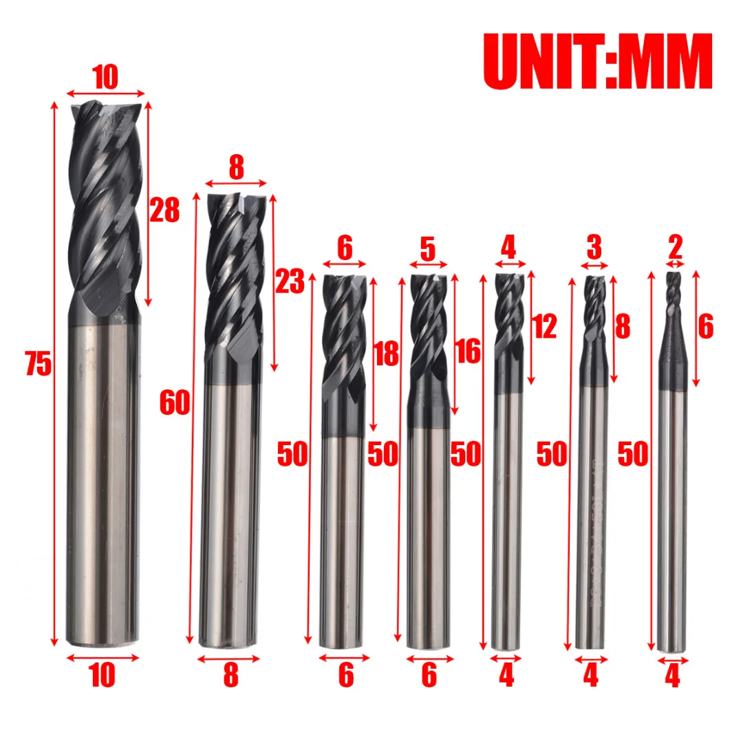 B: 7 шт. x фреза (2 мм, 3 мм, 4 мм, 5 мм, 6 мм, 8 мм, 10 мм)