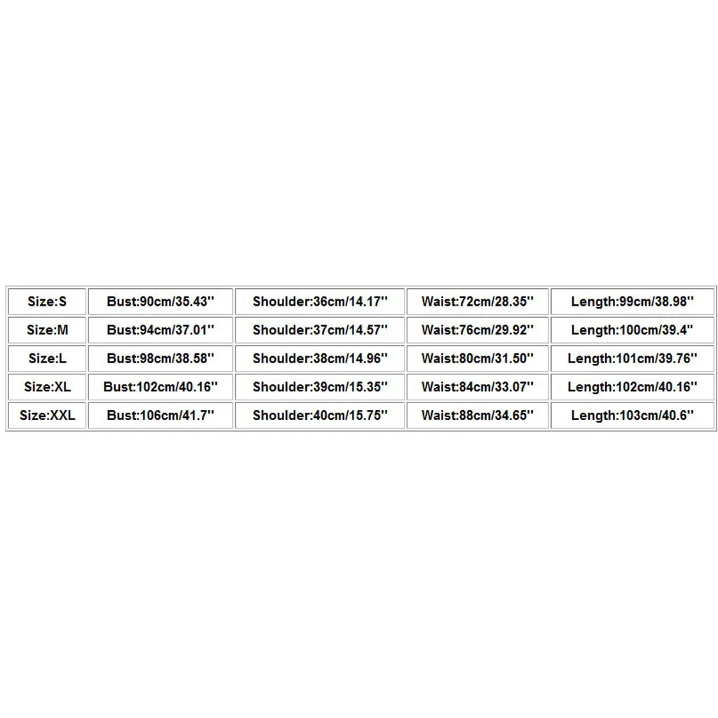 Примечание: Из-за возможных физических различий между различными мониторами фотография товара является только иллюстрацией и может не точно отражать фактический цвет полученного товара РазмерБюстПлечоТалияДлинаS90 см/35,43''36 см/14,17''72 см/28,35''99 см/38,98''М94 см/37,01''37 см/14,57''76 см/29,92''100 см/39,4"L98 см/38,58''38 см/14,96''80 см/31,50''101 см/39,76''XL102 см/40,16''39 см/15,35''84 см/33,07''102 см/40,16''XXL106 см/41,7''40 см/15,75''88 см/34,65''103 см/40,6''