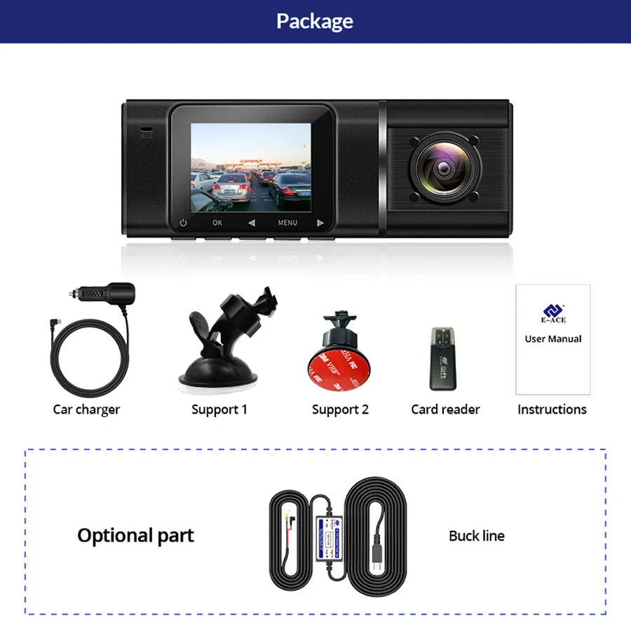 Этот автомобильный видеорегистратор имеет две камеры 1080P, фронтальную камеру + 720P внутри камеры, которая позволяет одновременно записывать видео.