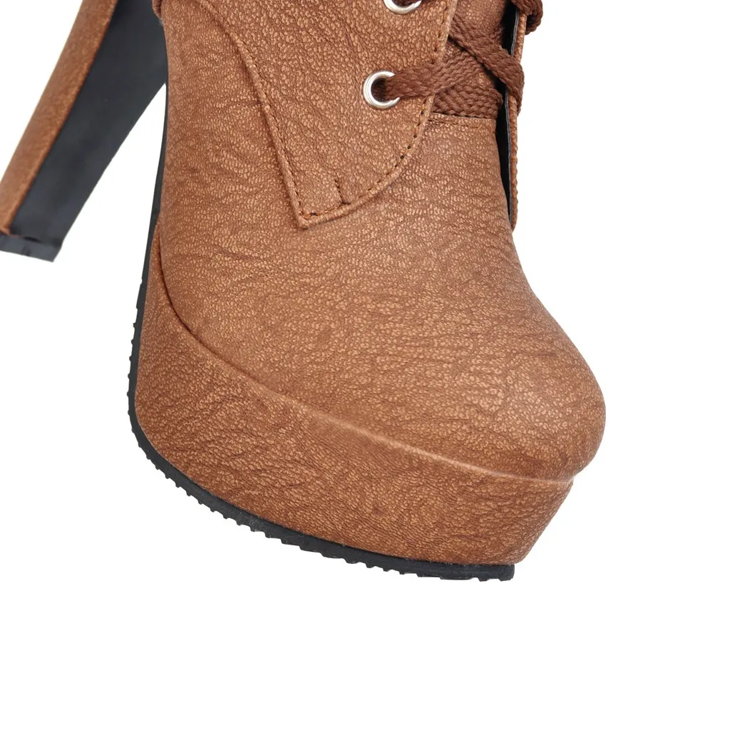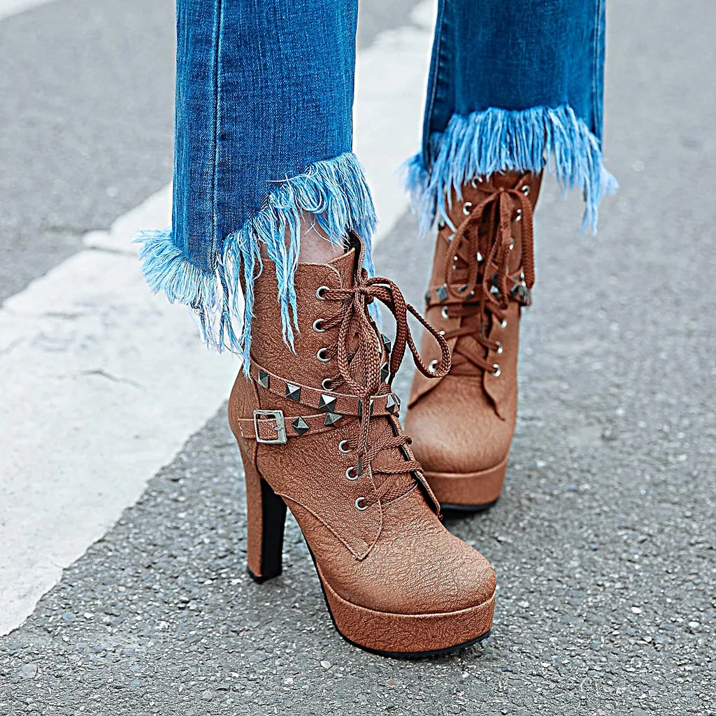 Оригинальные Модные ботильоны с заклепками; Женская обувь черного цвета с перекрестной шнуровкой на платформе и не сужающемся книзу массивном каблуке; Удобная женская обувь размера плюс. Пожалуйста, используйте нашу таблицу размеров при выборе размера.