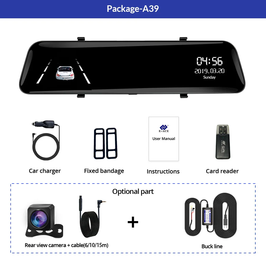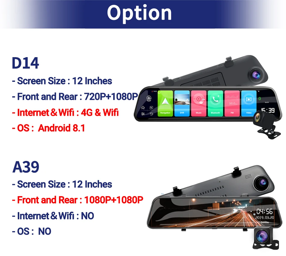 ● Тип установки: зеркало заднего вида, подходит для всех транспортных средств с зеркалом ● Размер экрана (дисплея): сенсорный экран 12,0 дюйма ● ОЗУ: 2 Гб; ПЗУ: 32 ГБ (D14); ● Система: D14 Поддержка Android 8,1 ●Video Разрешение: D14 Передняя: 1280*720P @ 25 кадров в секунду; Задняя: 1920*1080P @ 30 кадров в секунду A39 на передней панели:1920*1080P@ 30 кадров в секунду; Задний: 1920*1080P @ 30 кадров в секунду ● Видеокод: H.264 ● Gps-навигация: Поддержка D14 ● Sim-сеть: Поддержка D14 (3G /WCDMA:2100(B1) GSM:900(B8)/1800(B3); 4G/LTE:FDD,2100(B1) GSM:900(B8)/1800(B3) WCDMA:2100(B1)900(B8) ●WIFI: D14 поддержка ●Bluetooth: D14 поддержка Упаковочный лист Основные: ● 1 упаковочная коробка • 1 х DVR ● Руководство пользователя-1 шт. ● 1 gps-модуль (D14) ● 1 линия понижения (D14) ● 1 автомобильное зарядное устройство (A39) ● 1 камера заднего вида ночного видения 1080P с кабелем длиной 6 метров (опционально) ● 1 x камера заднего вида ночного видения 1080P с 10 метрами (опционально) • 1 х понижающий линии в течение 24 ч мониторинг парковки (опционально) ● 1 высокоскоростная tf-карта реального класса 10 (опционально) Обратите внимание ● О сети D14: прежде чем разместить заказ, пожалуйста, проверьте, находится ли ваша местная сеть sim-карт ниже полос или нет: 3G /WCDMA:2100(B1) GSM:900(B8)/1800(B3); 4G/LTE:FDD,2100(B1) GSM:900(B8)/1800(B3) WCDMA:2100(B1)900(B8) В противном случае Автомобильный видеорегистратор не определит вашу sim-карту. ● Около 24 ч мониторинг: видеорегистратор совместим только с автомобилями, которые имеют блок питания 12 В. Источник питания 24 В сгорит материнскую плату. Если вы хотите использовать 24 В, пожалуйста, добавьте 24 В в 12 В конвертер (BL). ● О видео: наш Автомобильный видеорегистратор FHD 1080P видео рекордер, должен использовать высокое качество класса 10 TF карты, любое низкое качество/низкая скорость TF карты все не могут поддерживать наши видеорегистраторы работают нормально, если вы не можете убедиться, что у вас хорошая TF карта, пожалуйста, купите нашу оригинальную TF карту вместе. Основные функции