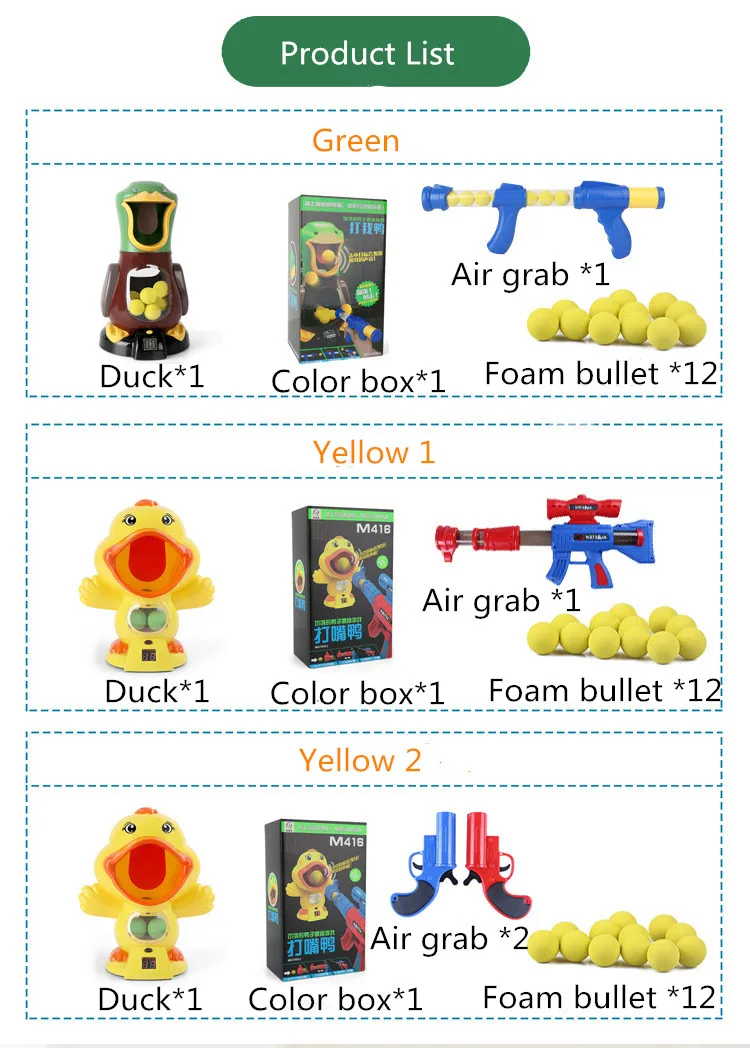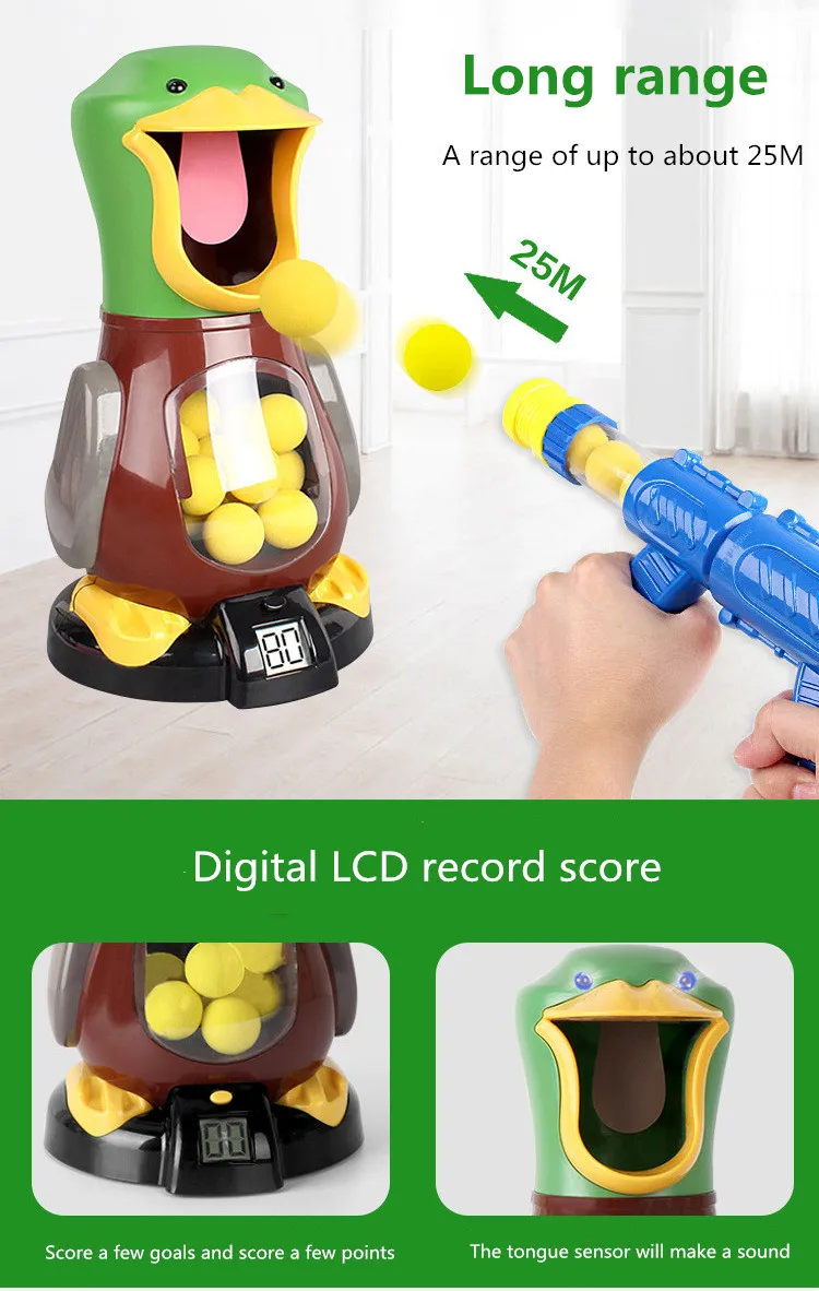 В комплект входит: 1 пистолет + 12 шаров + утка