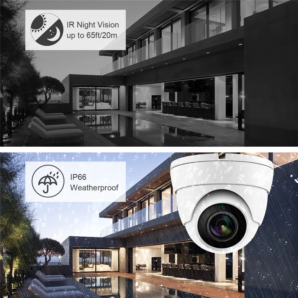 Идеально подходит для использования вне помещения. Обладая широким диапазоном рабочих температур, он предназначен для выдерживания экстремальных температур и защищен от пыли и дождя. 2,8 мм объектив с фиксированным фокусным расстоянием на эту камеру предлагает впечатляющий 108 ° Поле зрения для того чтобы покрыть и защитить более широкую область, используя меньше устройств для активна из-за большого количества.