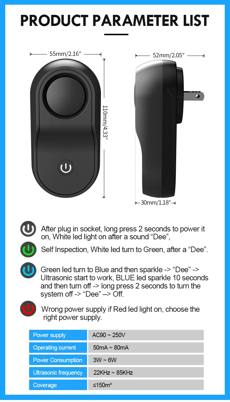 Особенности 1. Нет больше вредителей в вашем доме: наш Отпугиватель вредителей излучает мощный ультразвуковой, который эффективно отпугивает почти все вредители, такие как мыши, комары, муравья, крысы, локоны, пауки, мухи и другие насекомые. Останавливает раздражающие вредители от возвращения в ваш дом. 2. Экологически чистый и безопасный дизайн, без химических веществ, без запаха, нетоксичный и без излучения. 100% безопасно для человека и домашних животных. 3. Широкий эффективный охват: новейший 8 Вт Мощный Отпугиватель вредителей, с улучшенными 4D двойными динамиками, обеспечивает покрытие на 360 ° почти 2000 кв. футов, вот почему наш Отпугиватель вредителей более эффективен, чем обычные 2 Вт на рынке.