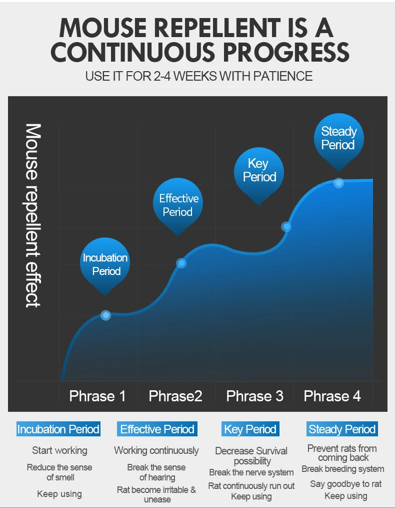 1. Эта машина должна быть установлена на расстоянии 80 ~ 120 сантиметров от пола и должна быть вертикальной до пола и подключаться к розетке. 2. В пределах 1 метра не должно быть большого препятствия (который не устанавливается в холодильнике, шкафу, диване и других предметах сзади). 3. Это нормально, что мышь и вредители будут увеличиваться в начале использования дней, потому что они уходят от живого места после атаки ультразвука. Обычно это может занять 3-4 недели, чтобы заметить результаты.