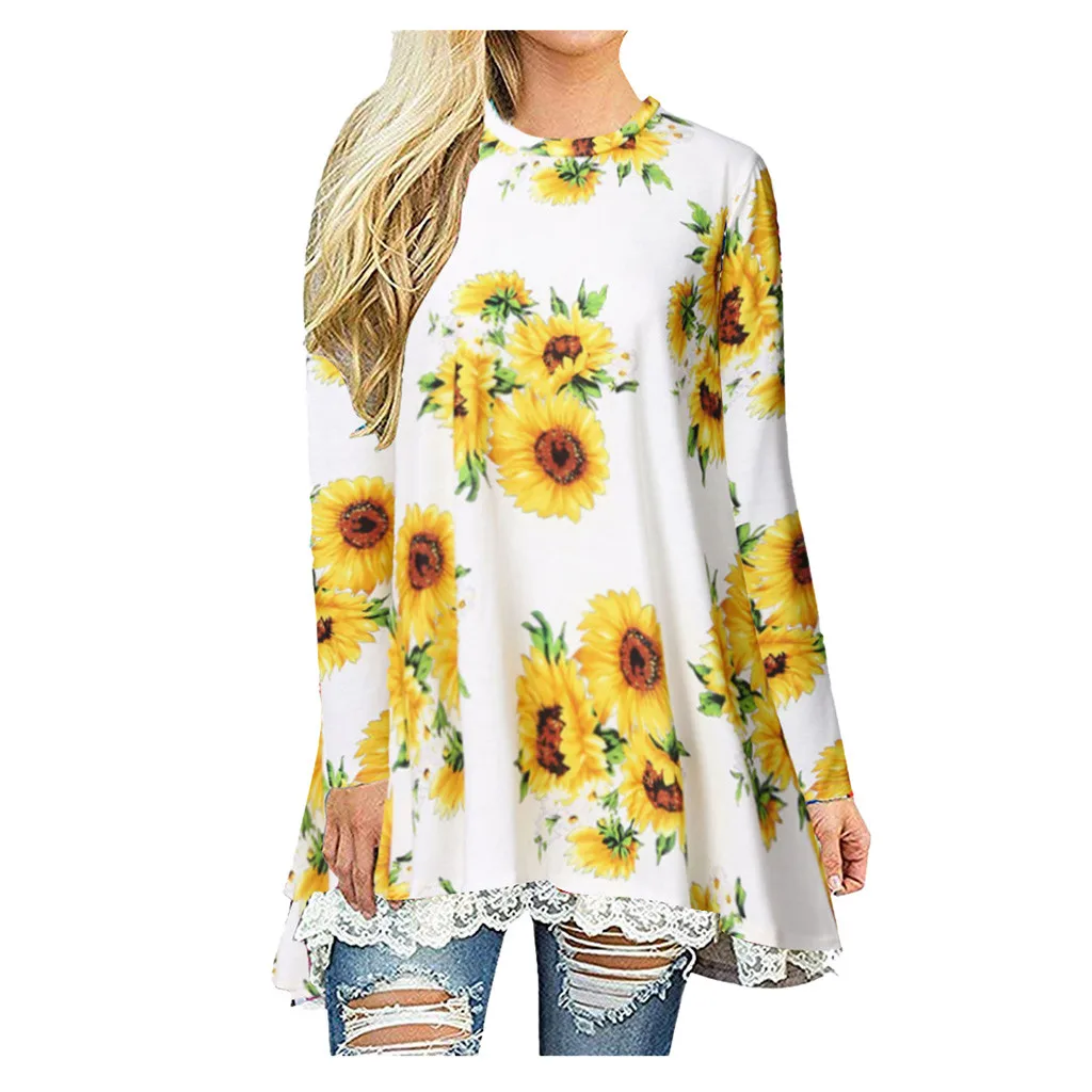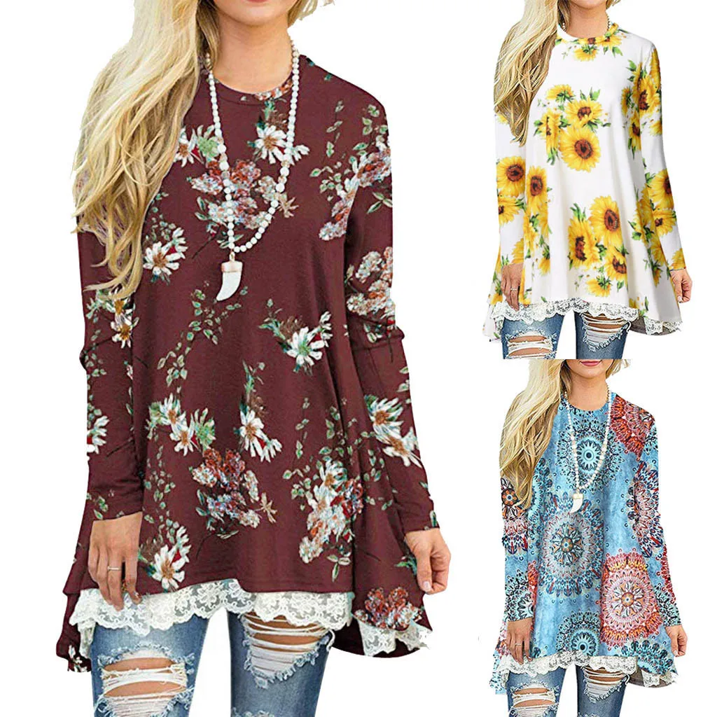Женские топы с длинным рукавом, кружевная блузка-Туника трапециевидной формы с круглым вырезом