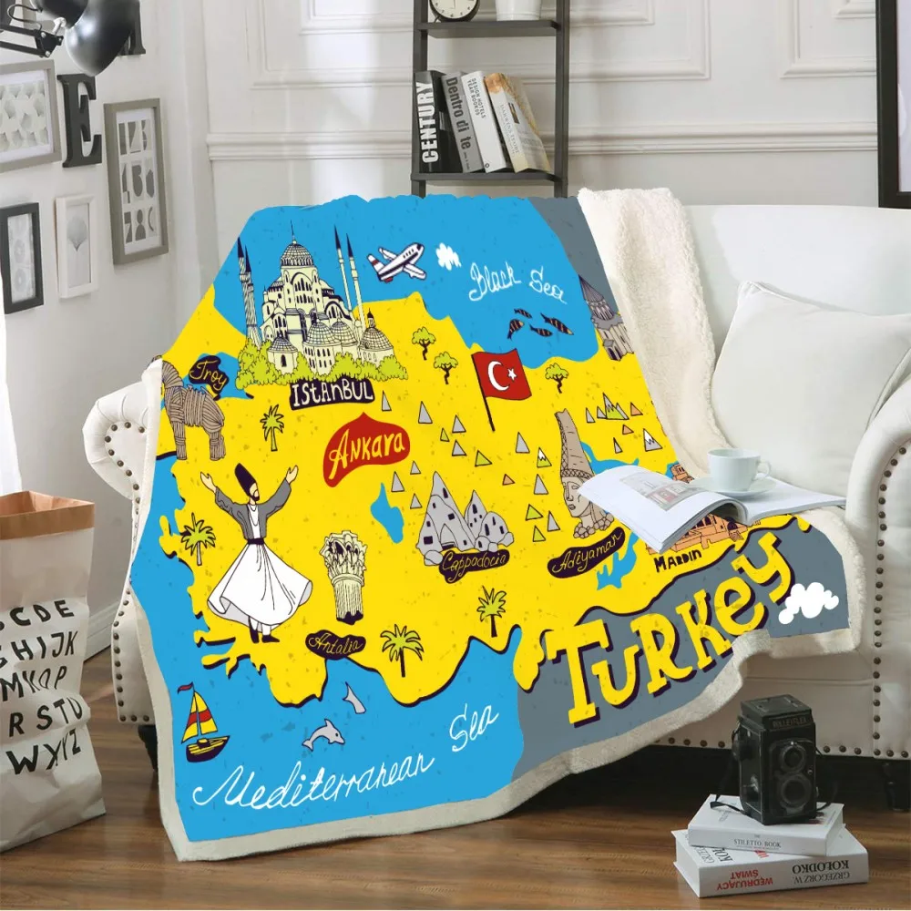 Индейка карта зимнее мягкое шерстяное Коралловое одеяло креативное Рисование желтое синее пледы одеяло до колена уютное одеяло для путешествий и вечеринок