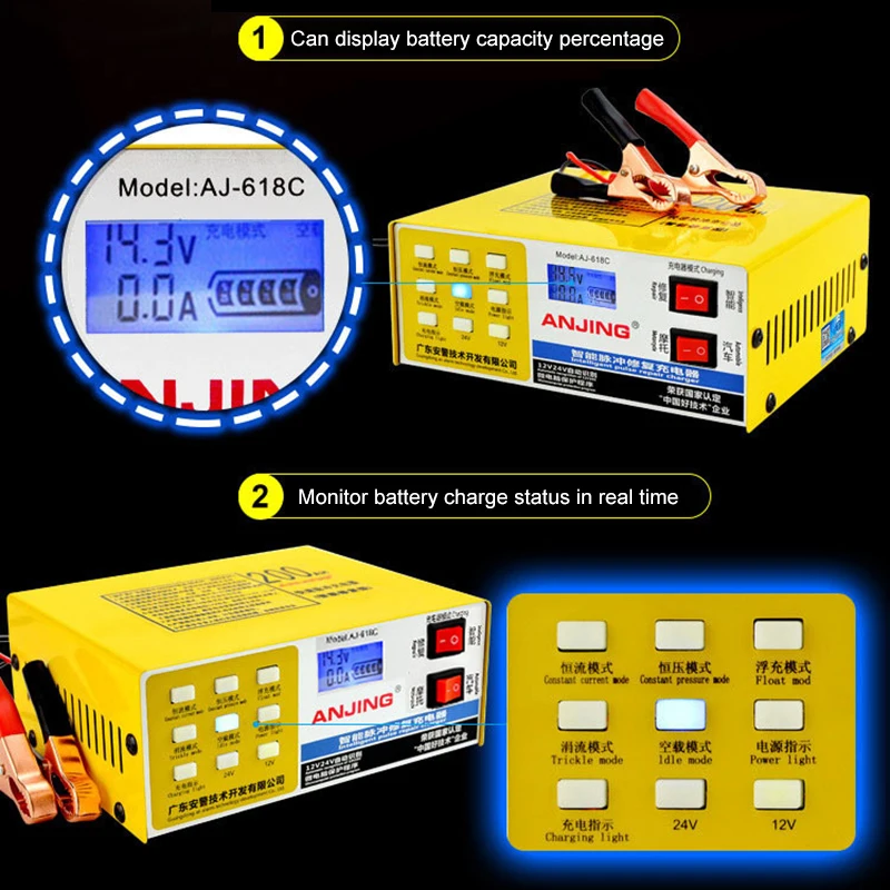Диапазон зарядки: подходит для всех типов аккумуляторов на рынке 12 В, 24 В, 6AH-200AH (кроме железной литиевой батареи)