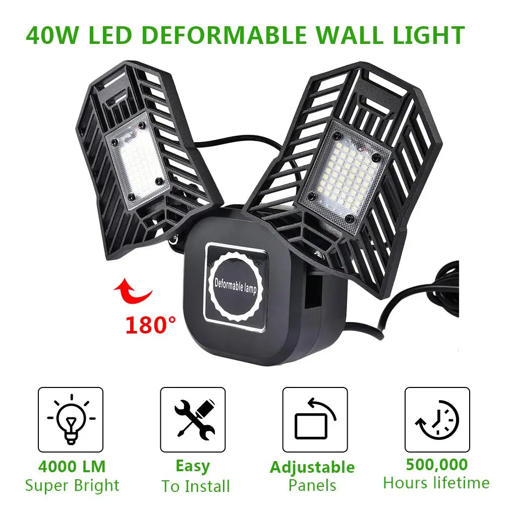 1. 【Превосходный деформируемый светодиодный настенный светильник 】 светодиодный настенный светильник с 2 регулируемыми крыльями и ослепляющим 4000 люменов, обновленный 40 Вт супер яркий светильник гаража будет вашим новым любимым светильник! Используйте Настенный светильник, чтобы направить этот мощный светильник точно там, где он вам нужен, что делает его отличным hands-free светильник. Попрощайтесь с dim!1x светодиодный светильник лампочка