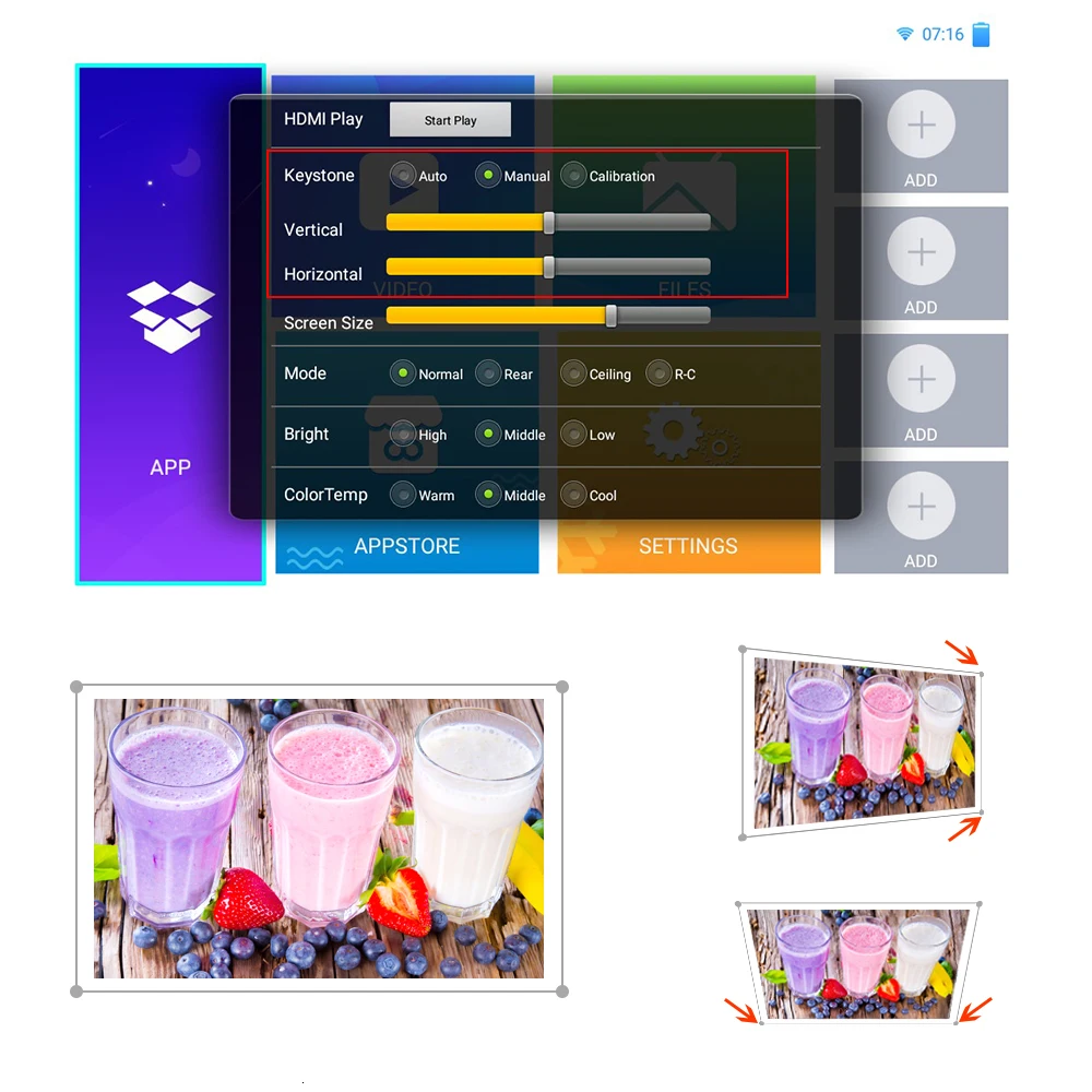 * Поддержка автоматической и ± 40 градусов по вертикали и горизонтали трапецеидальной коррекции;