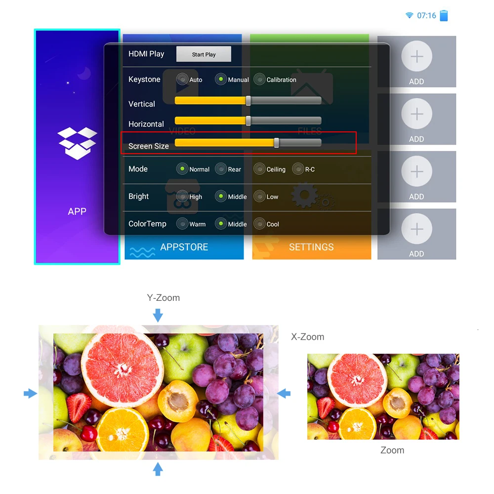 Поддержка проекционного зума, вы можете регулировать размер проекции, когда проекционное расстояние фиксируется.