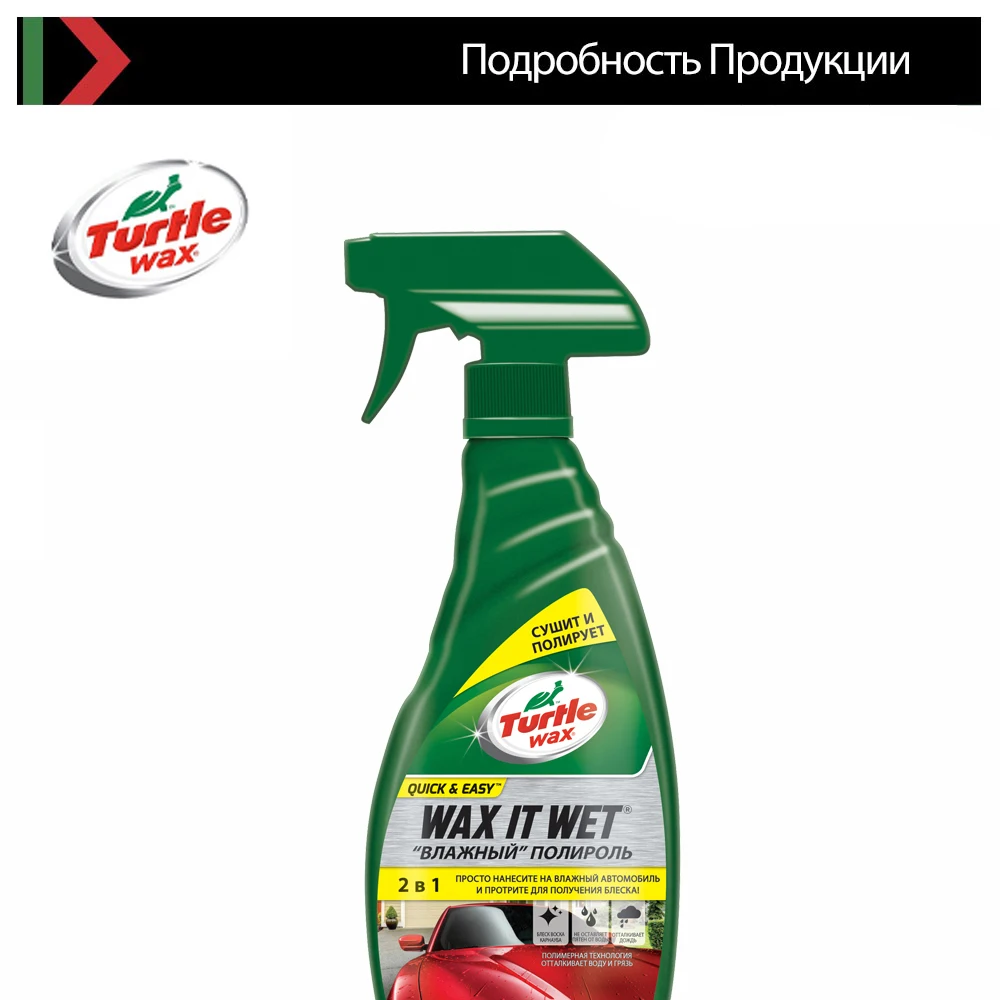 Влажный полироль для кузовных деталей производства Turtle Wax – это современное средство, которое имеет специально разработанную формулу с необычными составляющими. Главная особенность этого средства – это возможность наносить его на влажные поверхности. В этом случает Вам нет необходимости ждать пока кузовная поверхность высохнет после мойки автомобиля. Это значительно упрощает процесс ухода за автомобилями и делает его более быстрым, но не менее надёжным. Такой влажный полироль обладает такими же положительными свойствами, как и обычный полироль, который рекомендуют применять на сухие поверхности. В результате использования такого средства Вы сможете длительное время наслаждаться идеальным блеском.