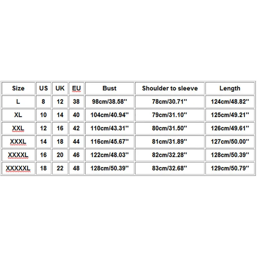 Что вы получаете: 1 женское платье РазмерыСШАВеликобританияЕСБюстОт плеча до рукаваДлинаL8123898 см/38,58 дюйма78 см/30,71 дюйма124 см/48,82 дюймаXL101440104 см/40,94 дюйма79 см/31,10 дюйма125 см/49,21 дюймаXXL1216 дюймов42110 см/43,31 дюйма80 см/31,50 дюйма126 см/49,61 дюймаXХХL141844116 см/45,67 дюйма81 см/31,89 дюйма127 см/50,00 дюймаXXXXL16 дюймов2046122 см/48,03 дюйма82 см/32,28 дюйма128 см/50,39 дюймаXXXXXL182248128 см/50,39 дюйма83 см/32,68 дюйма129 см/50,79 дюйма