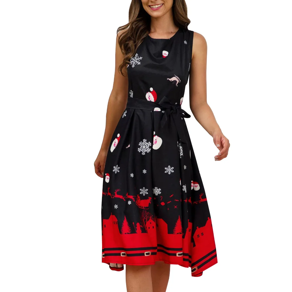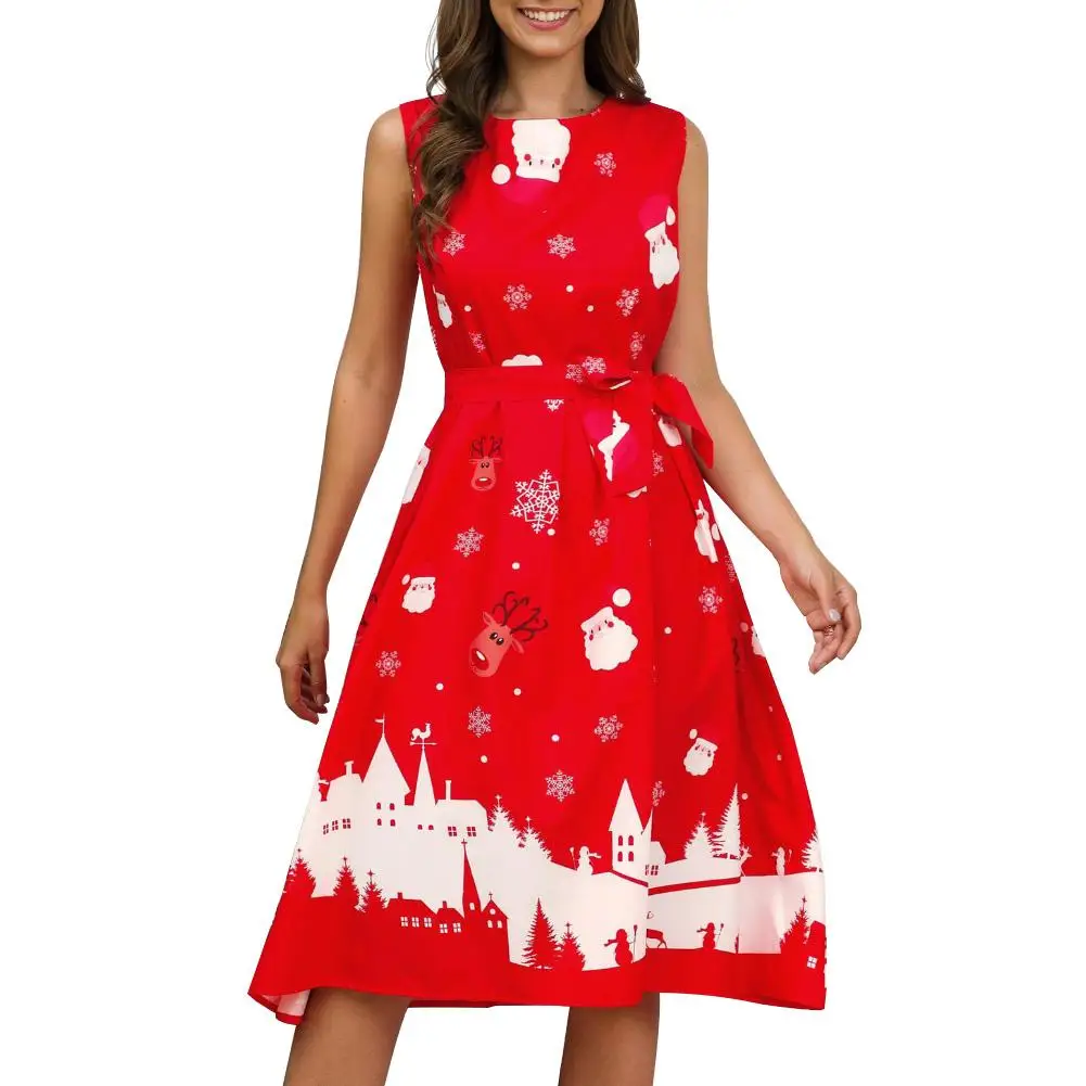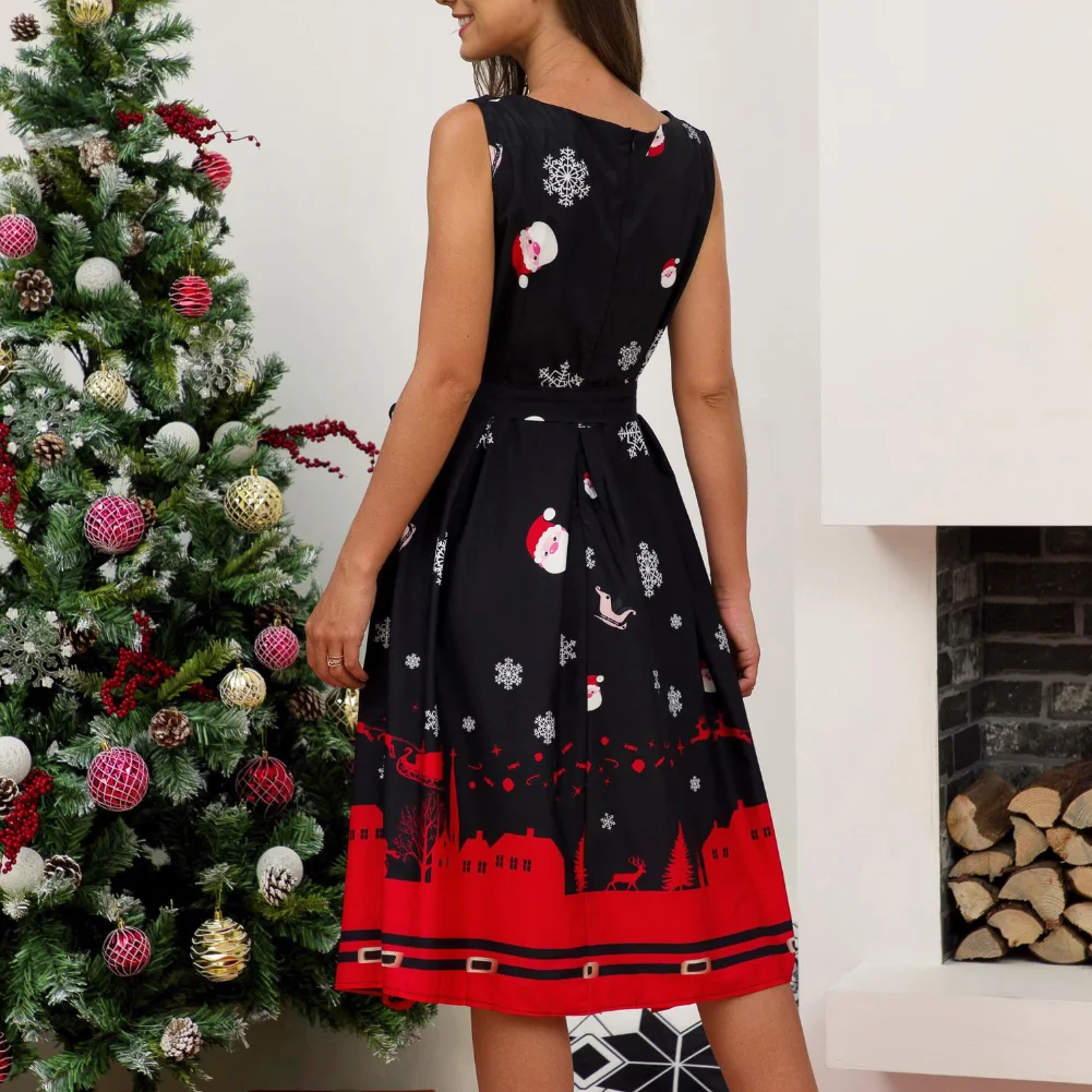 Рождественская Леди Снежинка Санта Клаус печати О образным вырезом без рукавов линии миди платье удобные рукавов Рождественская елка/носки/снег
