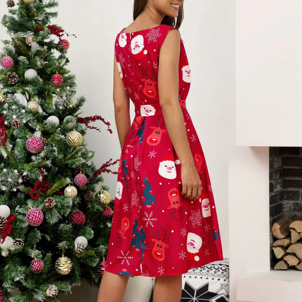 Рождественская Леди Снежинка Санта Клаус печати o-образным вырезом без рукавов линии миди платье