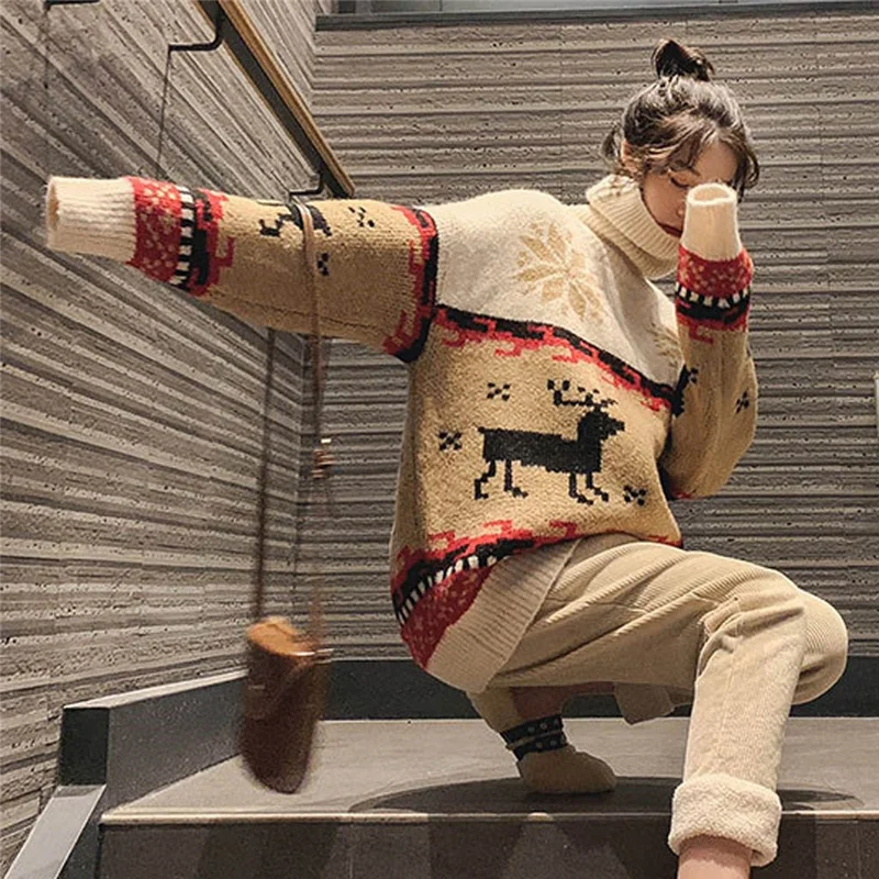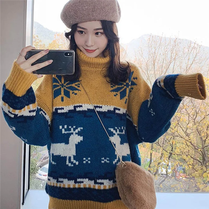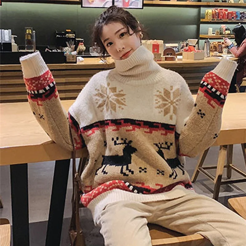 Женский трикотажный пуловер с круглым вырезом и длинным рукавом, веселый принт с рождественским лосем