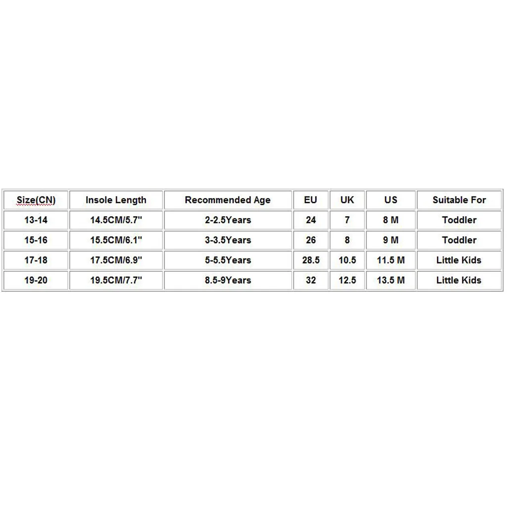 Размер (китайский) Длина стельки Рекомендуемый возраст ЕС Великобритания Свяжитесь с нами Подходит для 13-14 14,5 см/5,7" 2-2.5Years 24 7 8 м Для детей ясельного возраста 15-16 15,5 см/6,1" 3-3.5Years 26 8 От 9 месяцев Для детей ясельного возраста 17-18 17,5 см/6,9" 5-5.5Years 28,5 10,5 11,5 М Дети дошкольного возраста 19-20 19,5 см/7,7" 8,5-9 лет 32 12,5 13,5 М Дети дошкольного возраста