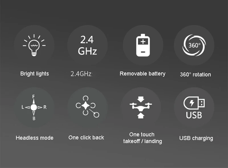 Цвет: черный, серебристо-серый Размеры: 8*8*3,2 см Возраст: 14 + Емкость аккумулятора: 500 мАч Батарея дистанционного управления: 3 батарейки АА Время зарядки: 40 минут Сигнал дистанционного управления: 2,4G Расстояние дистанционного управления: 80-100 м