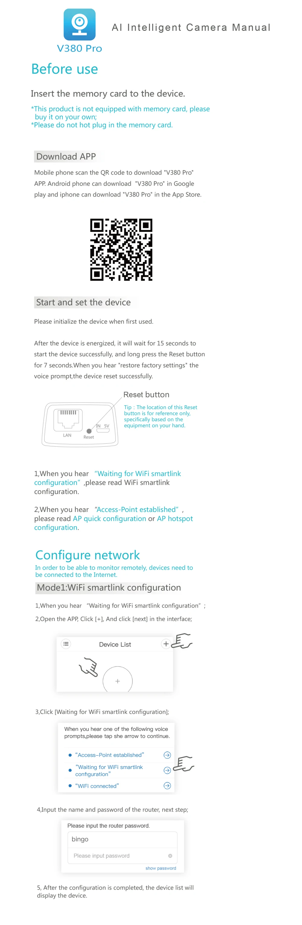 5. Откройте"V380pro«APP», выберите «+» в верхней части. Затем выберите «Добавить сетевое устройство», нажмите «Поиск LAN».