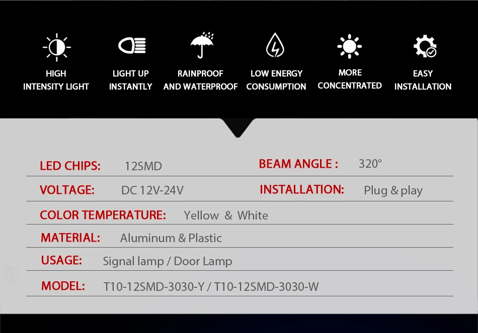 Specification: Socket Type: T10 Voltage: DC 12V-24V Color :Yellow /White Fitment: -Applicable To Most Car Model With T10 / T15 / 194 / 168 / 158 / 12256 / 12961 / 2821 / 825 / W5W Socket. -Also Compatible with 921 / 912 / 516 / 579 / 917 / 918 / 920 / 922 / 923 / 906 / 904 / 916 Socket. Application:Car Dome & map lights, Turn Signal lights, Side Marker lights, Dashboard lights, Door light License Lights ,Map Lights and so on.