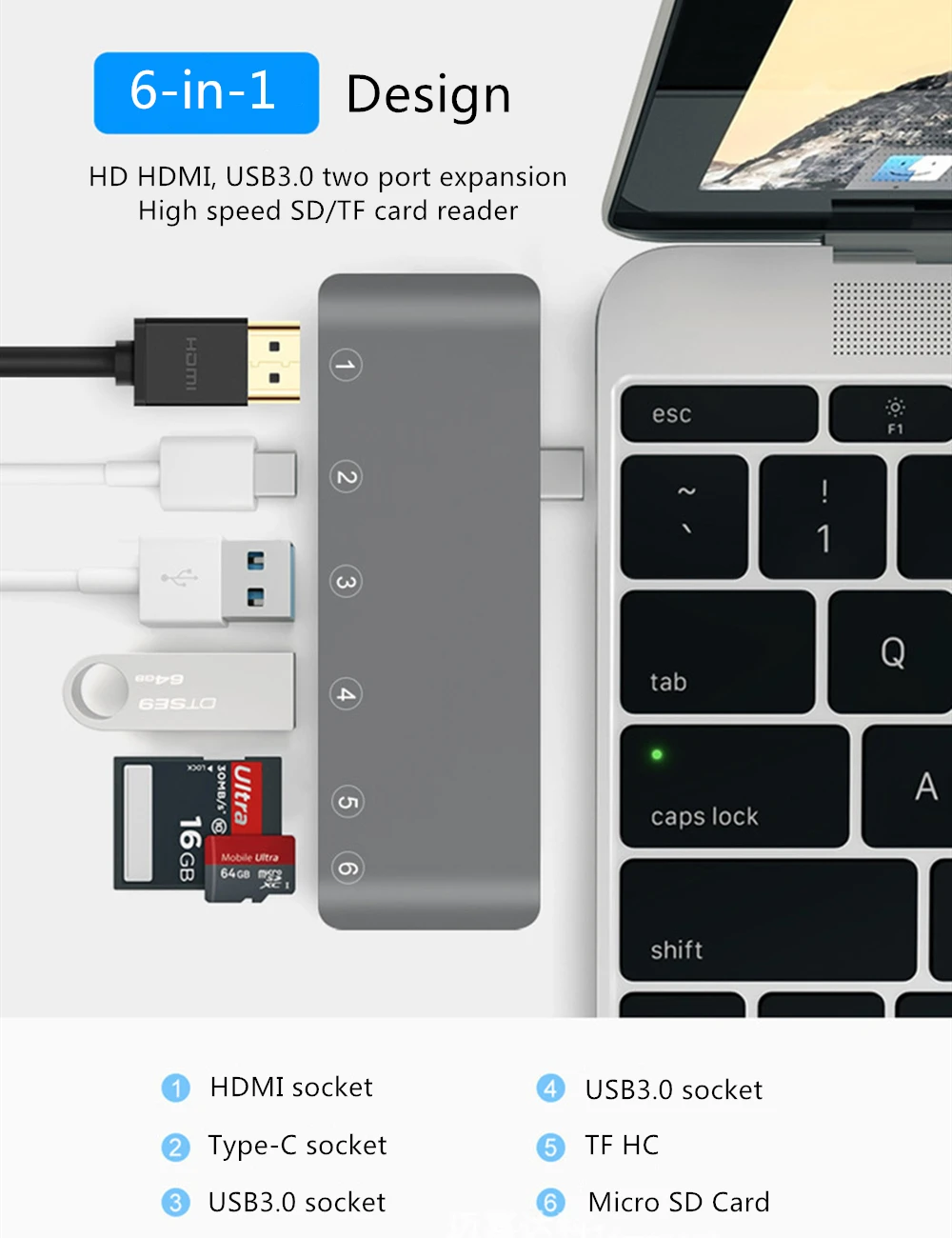 ● Цвет изделия: серый ● Разрешение: 4K ● Сердечник провода: 19 сердечника провода ● Материал: алюминиевый сплав ● Интерфейс: USB3.0 * 2 + SD + TF + Type-C + HDMI