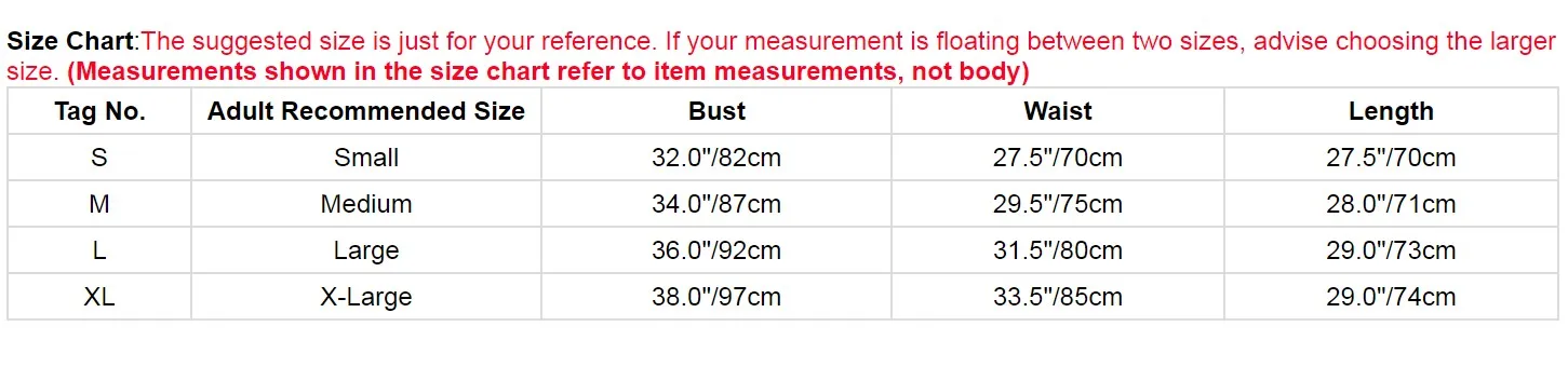 Size Chart:The suggested size is just for your reference. If your measurement is floating between two sizes, advise choosing the larger size. (Measurements shown in the size chart refer to item measurements, not body)