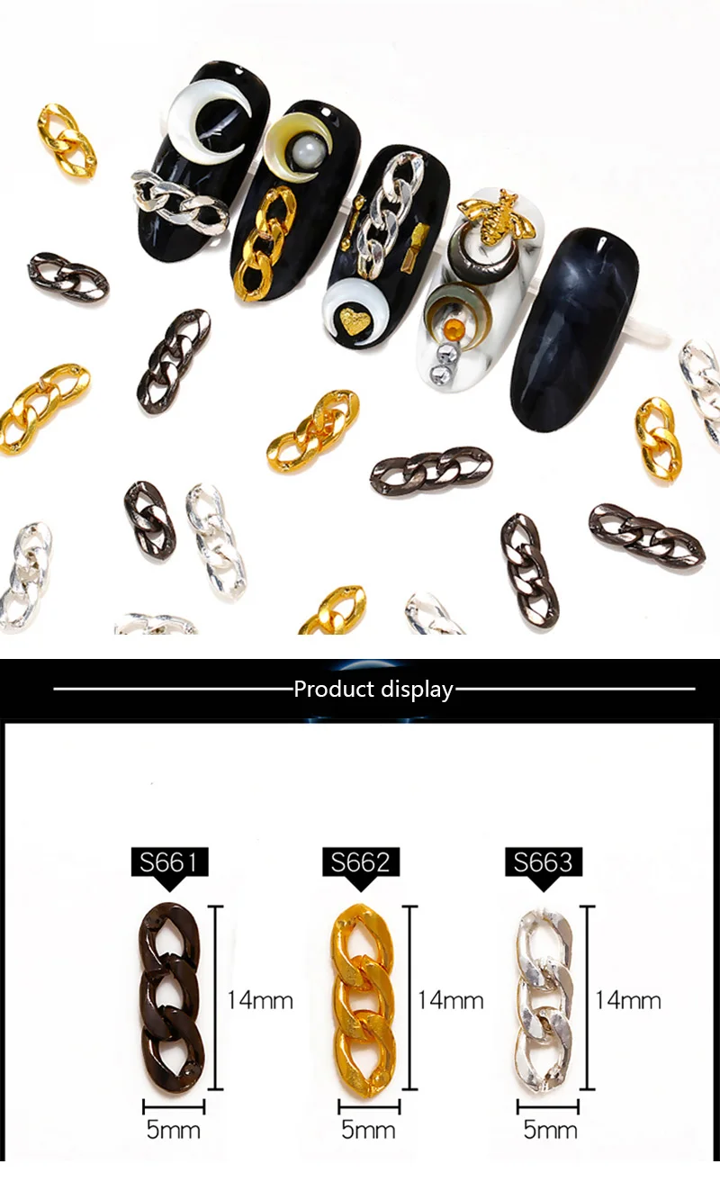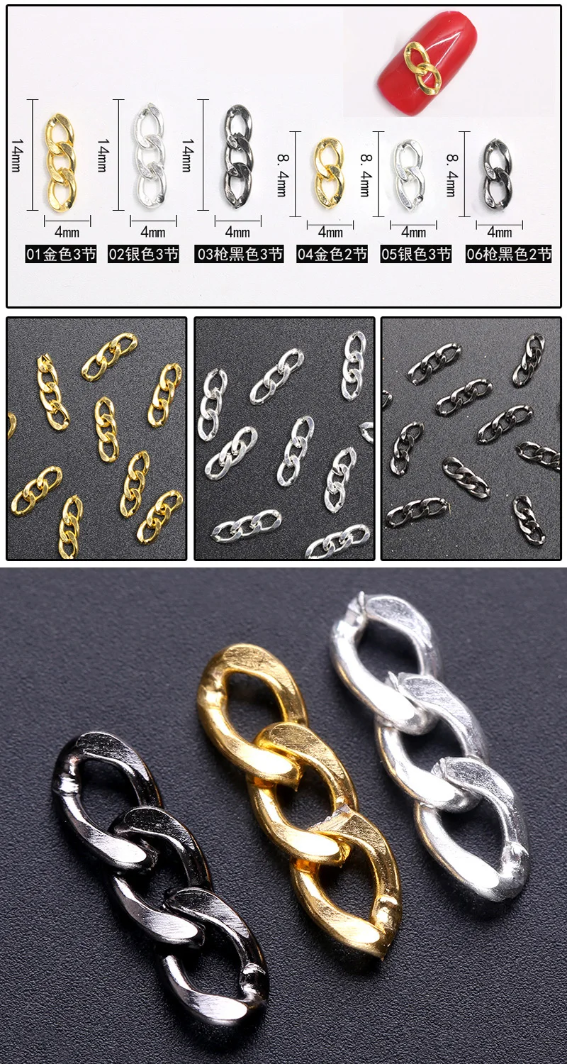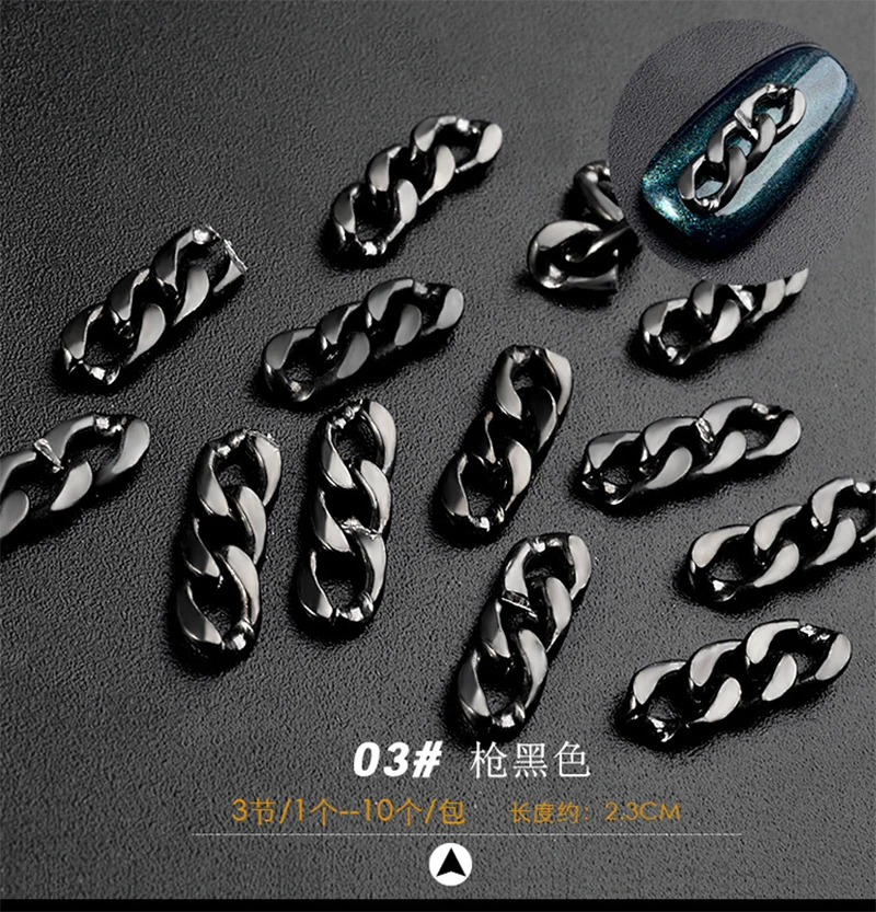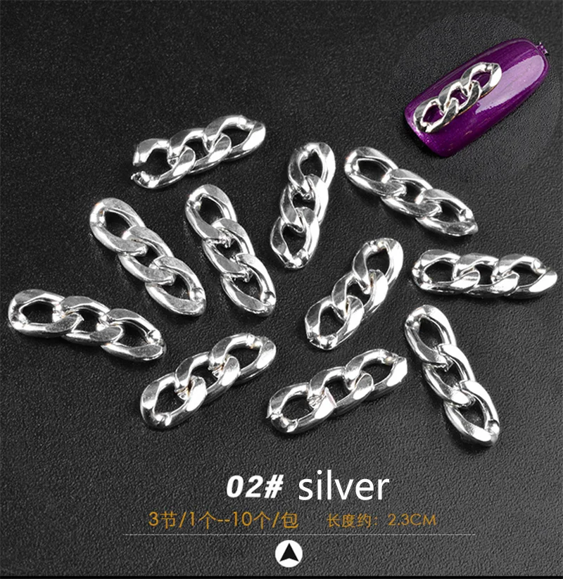 Описание: Материал: металл Количество: 10 шт./упак. Цвет: золото, серебро, черный Тип изделия: ювелирные изделия с украшением в виде цепочек пакет Содержание: 1 шт * нейл-арта цепи Особенности: дизайн для 3 секций, которые легко украшают. Легко наносится на ногти или искусственные ногти. Он также может использовать их для украшения вашего дома, сотового телефона, очков, карт, боди-арта и т. д. это может сделать ваш ноготь более красивым и элегантным.