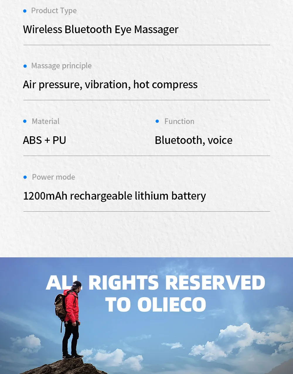 Название продукта: массажер для глаз Номинальное напряжение: 5 В постоянного тока Мощность: 3,4 W Адаптер питания: AC100-240V Bluetooth: Да Режим: 5 Характеристика: 1. Интеллектуальный массажер для глаз: новейший Интеллектуальный массажер для глаз в 2019 году. Благодаря всесторонней функции и элегантному внешнему виду, беспроводной Электрический массажер для глаз может помочь вам снять усталость глаз и уменьшить круги для глаз, обеспечивая Вам комфортный и приятный опыт. 2. Пять режимов массажа для снятия усталости глаз: интегрированный режим, четкий режим, режим сна, режим жизненной силы и умный режим в целом. Давление воздуха, вибрация, горячий компресс и музыкальные функции объединяются в различных режимах, чтобы вы наслаждались массажем Глаз Спа. 3. Управление одним нажатием кнопки: оснащен прозрачным ЖК-дисплеем, легко переключать различные режимы одним нажатием кнопки петли. Автоматическое время 15 минут устанавливается для экономии энергии и защиты глаз. Просто наслаждайтесь массажем после однодневной работы и усталости. 4. Удобное соединение Bluetooth: bluetooth-соединение позволяет наслаждаться любимой музыкой во время массажа после подключения массажера для глаз к вашему смартфону. 5. Портативный и Перезаряжаемый: массажер для глаз 180 ° складной, что делает его маленьким, чтобы положить в сумку и носить в путешествии. Ремешок регулируется для различных лиц. Встроенная перезаряжаемая батарея емкостью 1500 мА · ч, ее легко заряжать с помощью нашего кабеля USB для зарядки. Вопрос и ответ: Как включить/выключить массажер для глаз? Нажмите кнопку питания в течение 3 секунд, чтобы включить его или выключить. После включения зеленый светильник включается и переходит в интегрированный режим. Как изменить Режимы массажа? Нажмите кнопку питания менее 1 секунды, чтобы изменить режим массажа. Как подключить Bluetooth и воспроизводить музыку? Откройте Bluetooth вашего мобильного телефона и выполните поиск «YBY», затем подключите и Воспроизводите музыку. Примечание: 1. Пожалуйста, не используйте его при зарядке. 2. Каждый режим массажа имеет 15 мин настройки времени. Он перестанет работать автоматически. 3. Он показывает красный индикатор светильник при зарядке, а также обратиться к синий при полной зарядке. 4. Что вы получите: 1 x массажер для глаз 1 х чехол для хранения 1 х USB кабель для зарядки 1 x Руководство пользователя
