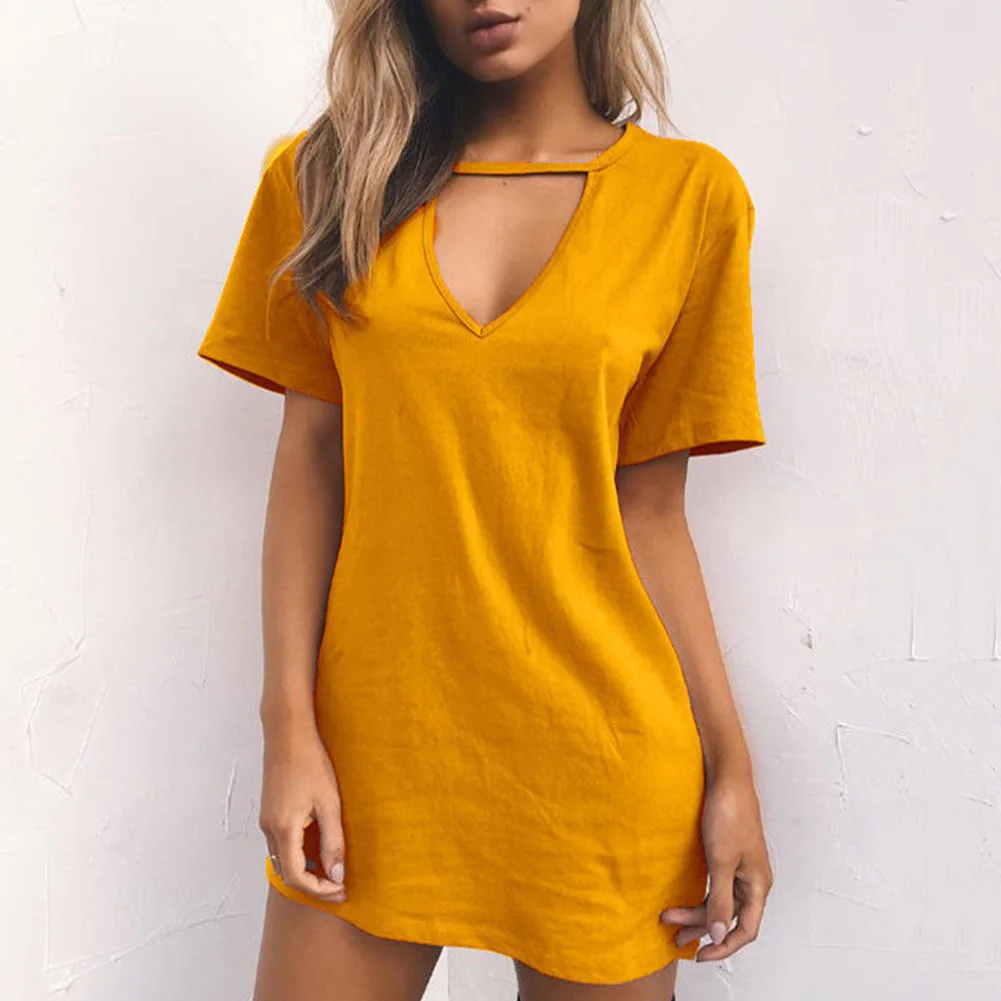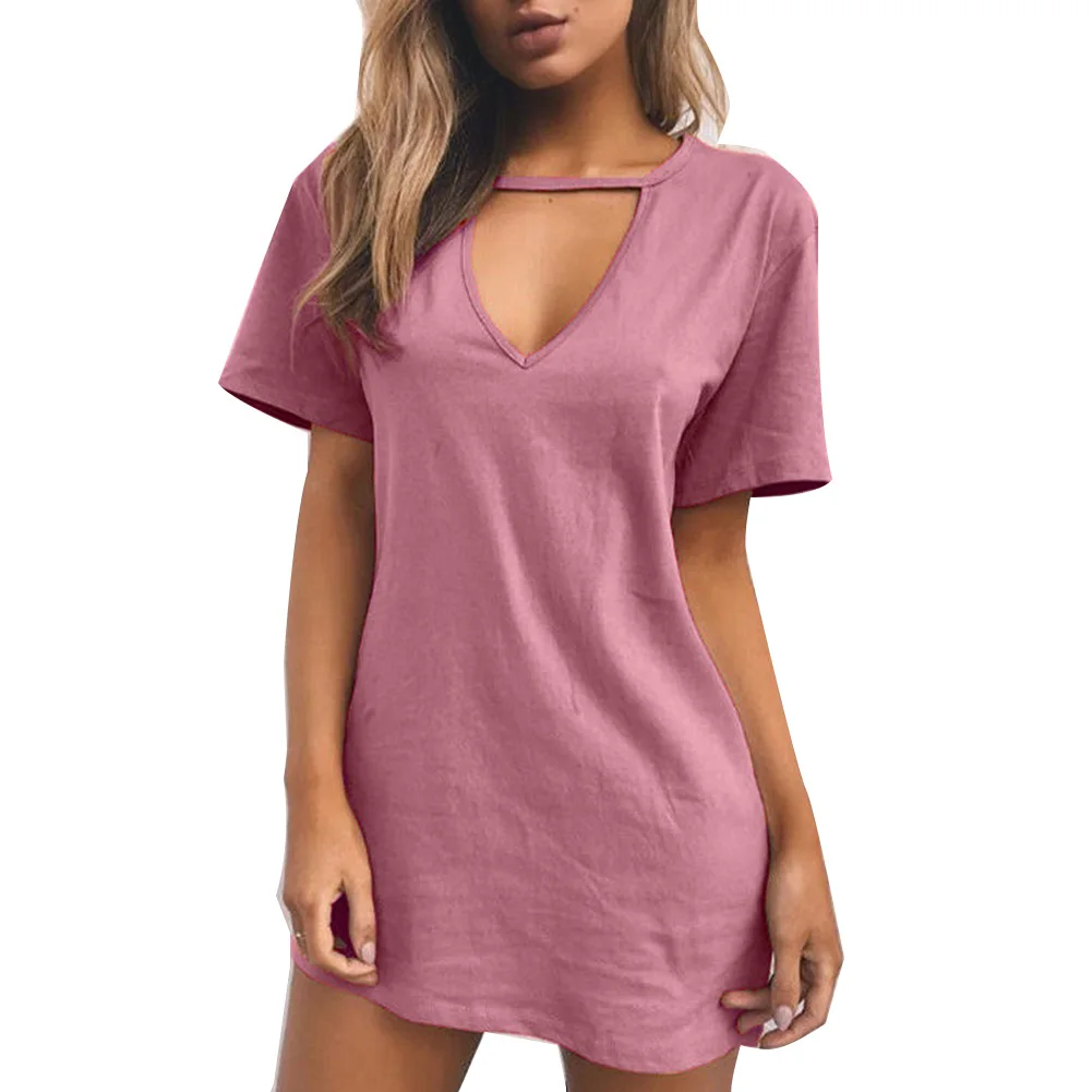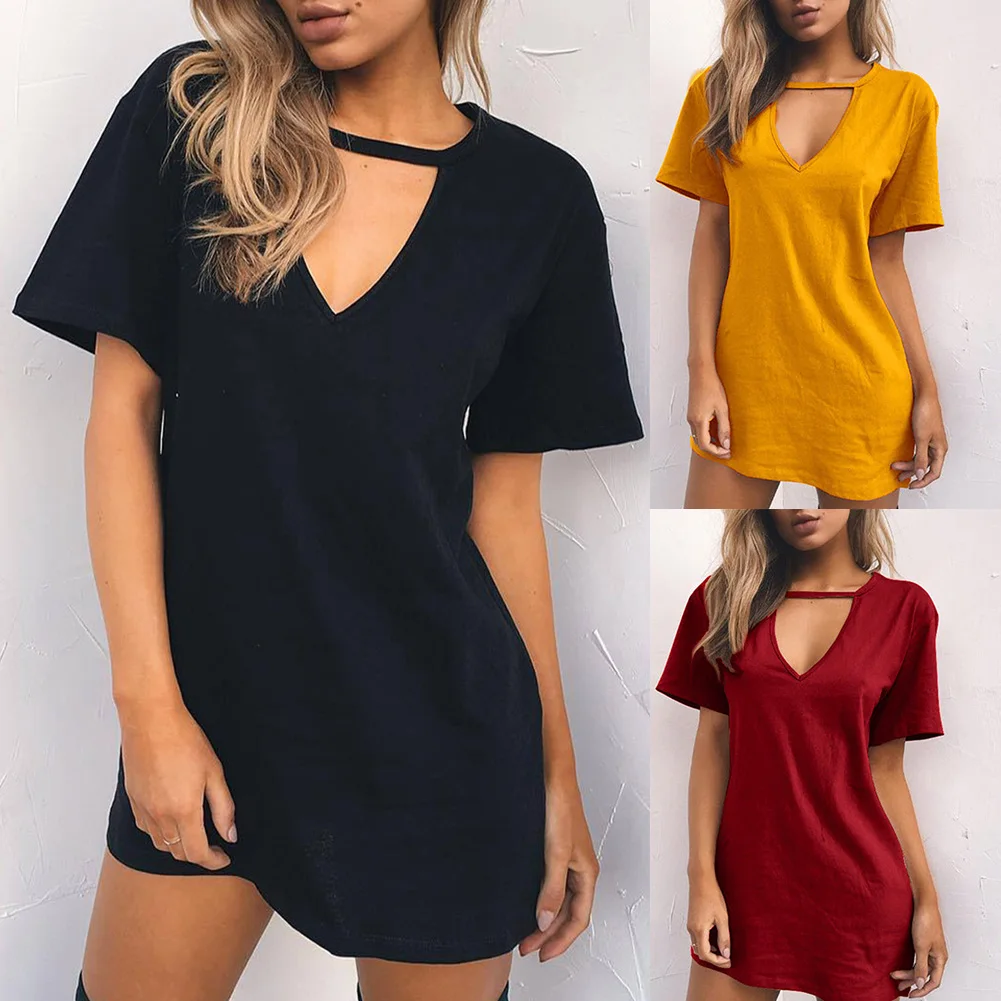 Модное женское однотонное повседневное свободное платье-футболка с V-образным вырезом и коротким рукавом