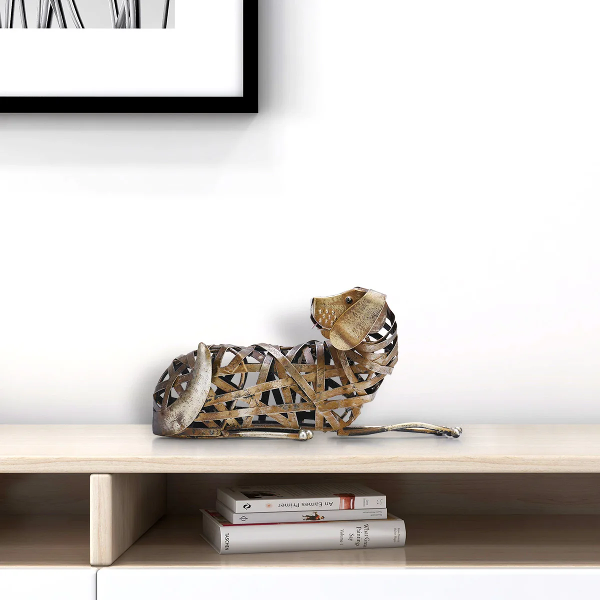 Creatively Design: The creatively designed braided dog sculpture woven from the iron ribbon. The dog lying on the floor and turned back to see something, full of cuteness.